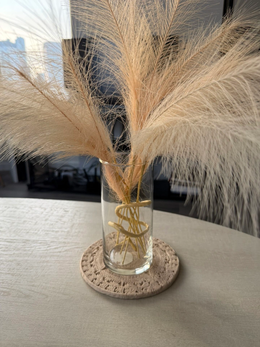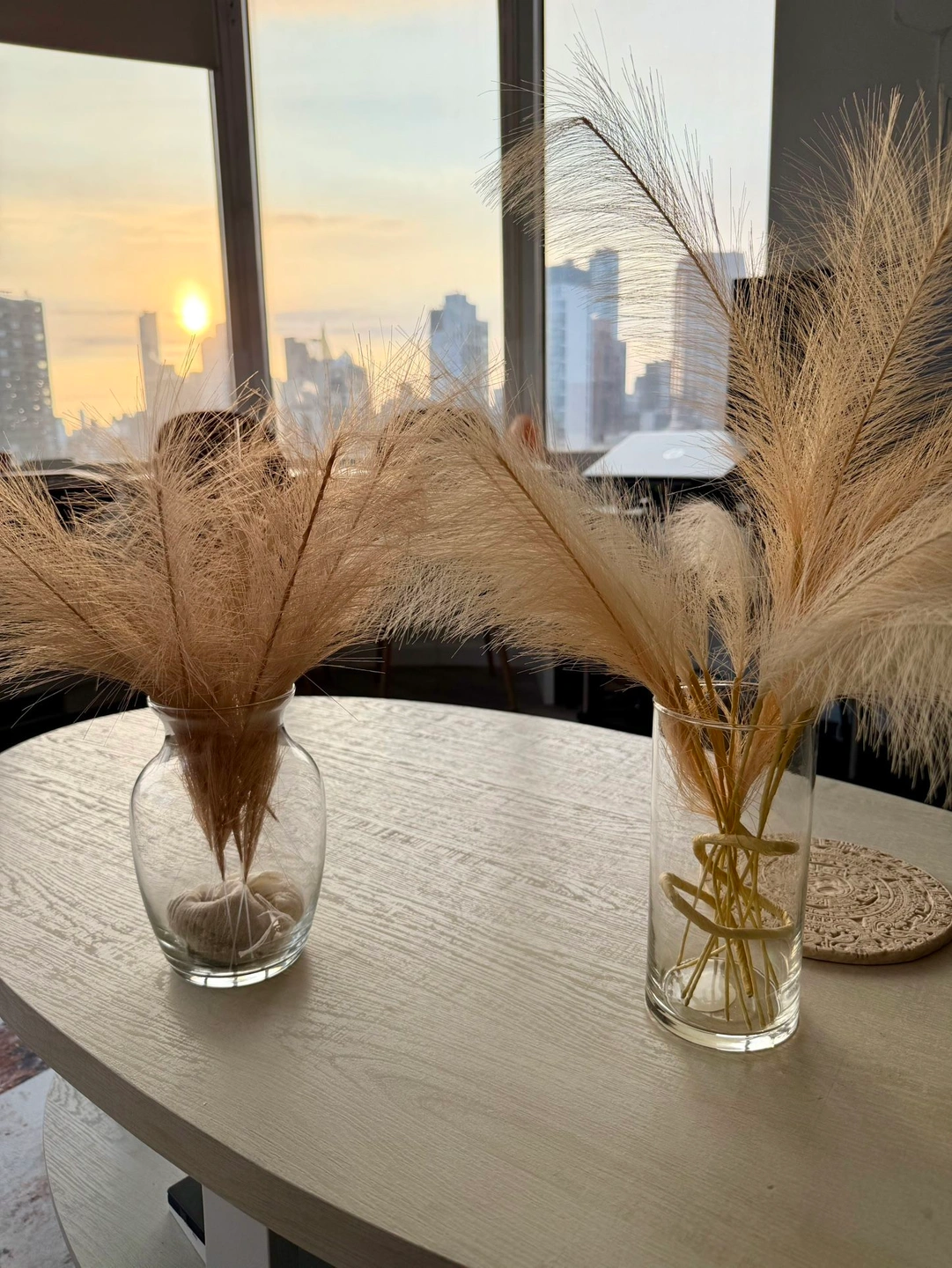 - Includes a tall cylinder vase and a rounded glass vase, both with faux pampas plumes.