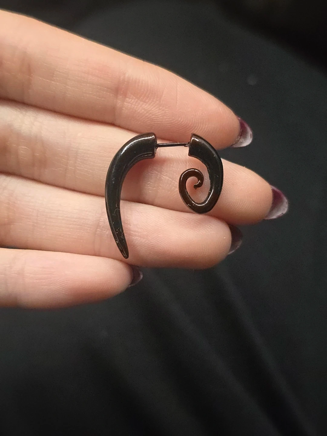 One black spiral piercing. It's a faux plug or stretcher style. Perfect for adding a unique touch to your look!