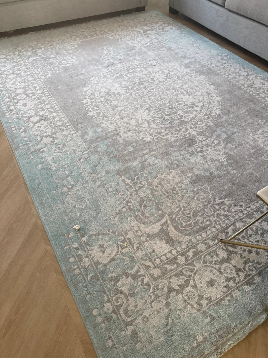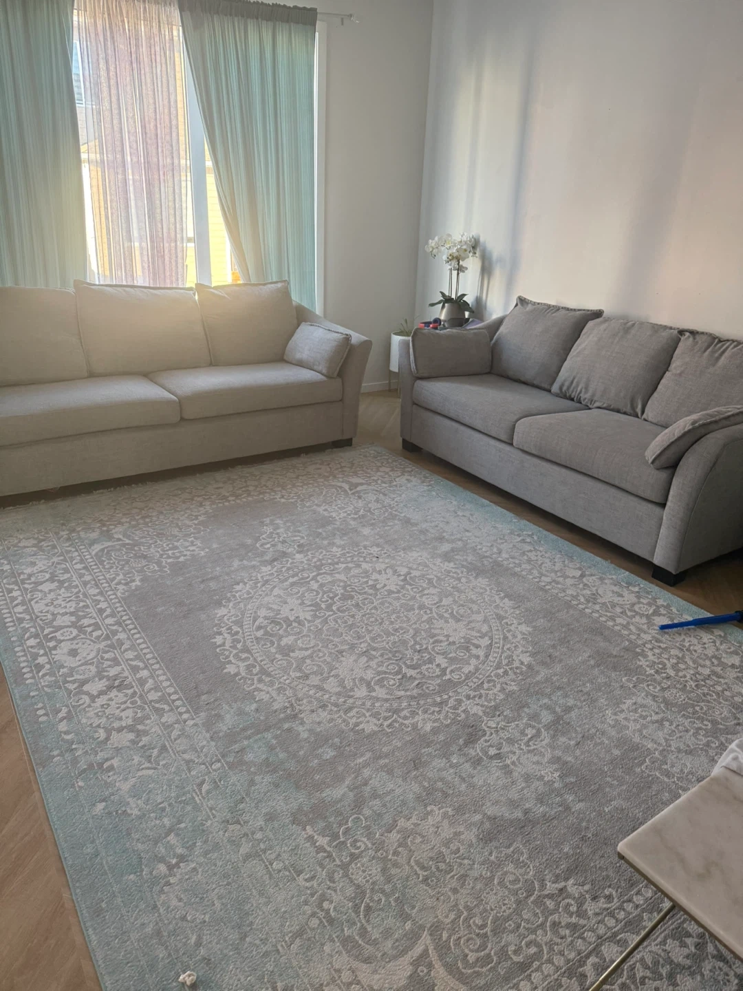 This is a comfy grey sofa with three large back cushions and two smaller armrest pillows. It's upholstered in a textured fabric. Perfect for a living room or den! covers come off for easy washing area rug included