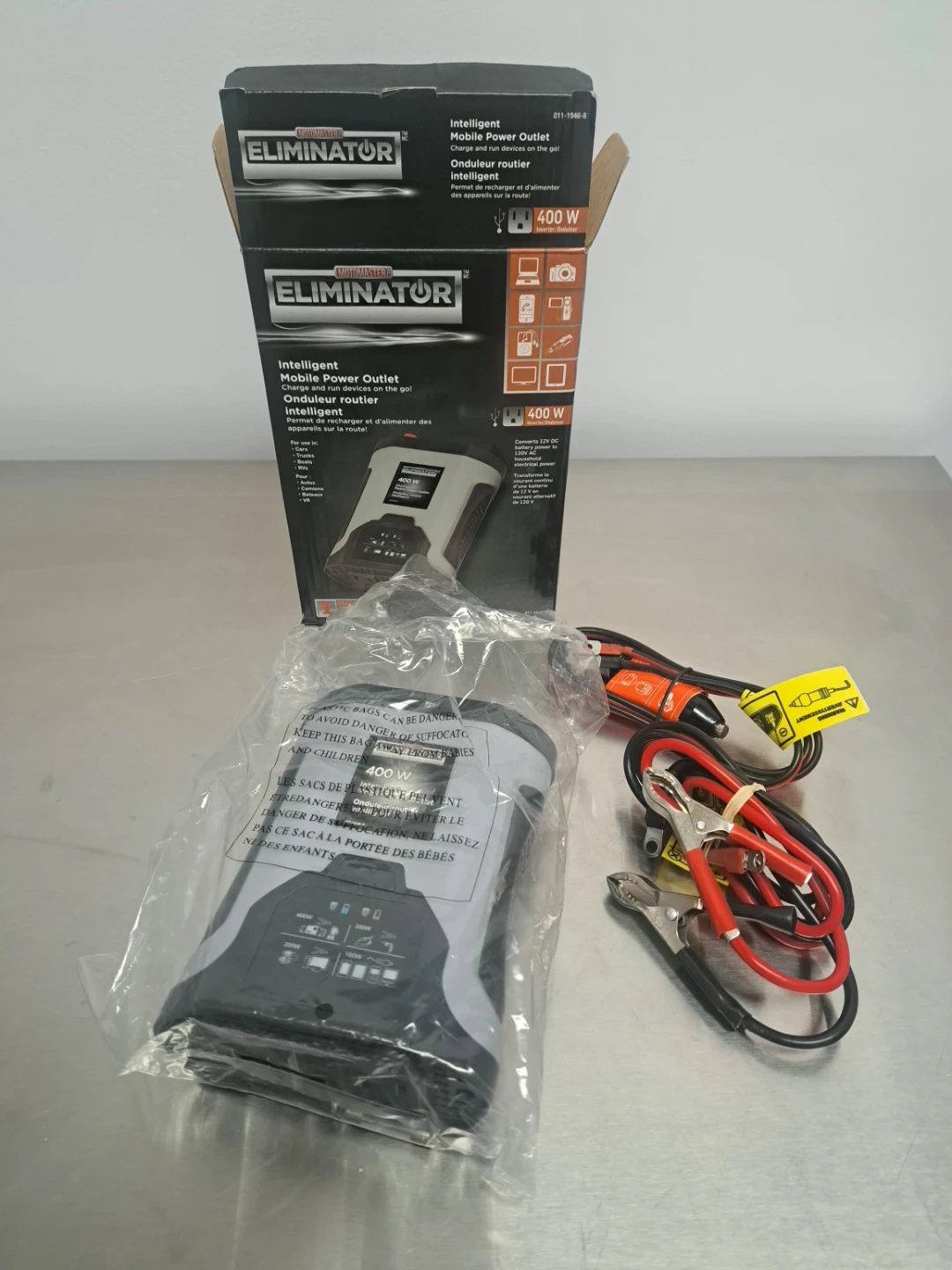 Selling an Motomaster Eliminator 400W Intelligent Mobile Power Outlet. It's in like-new condition and includes the original box. This power outlet is perfect for charging and running devices on the go, whether you're in a car, truck, boat, or RV. It converts 12V DC battery power to 120V AC household electrical power. Comes with all the necessary cables and accessories!