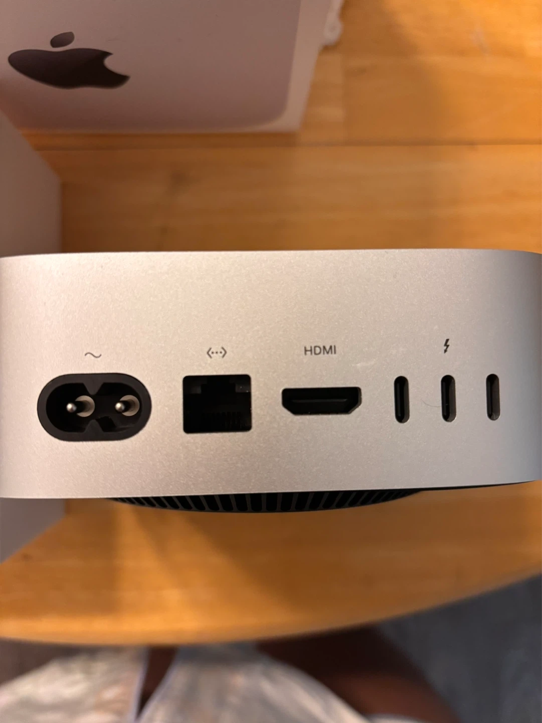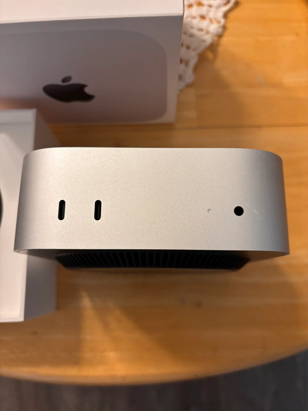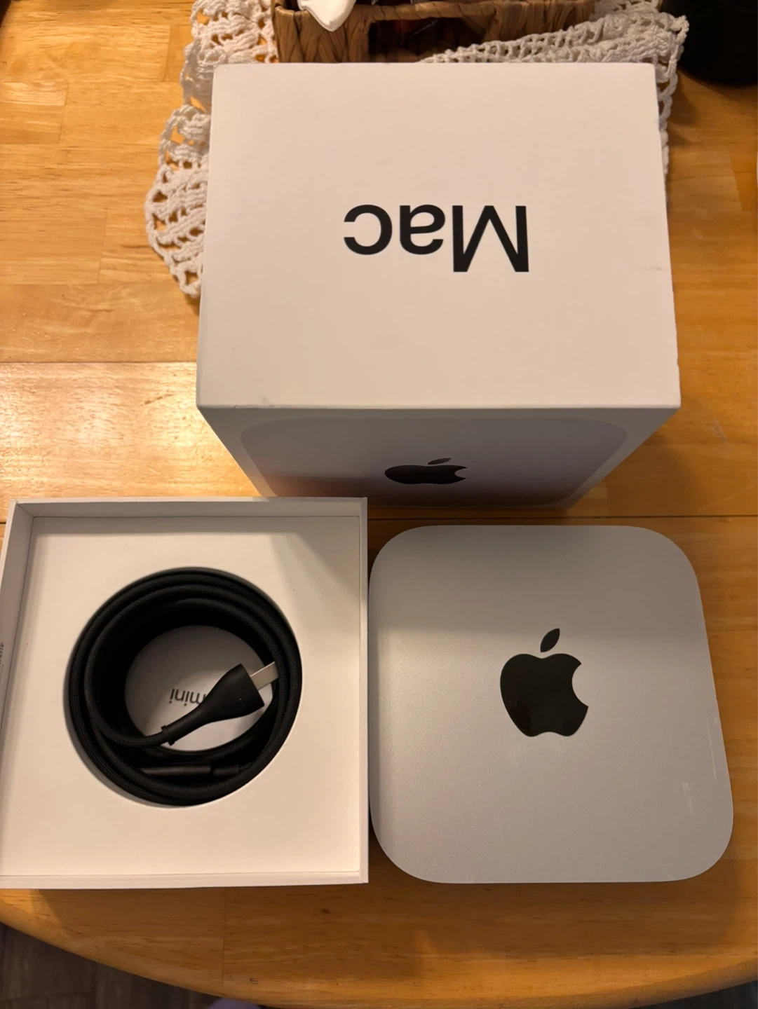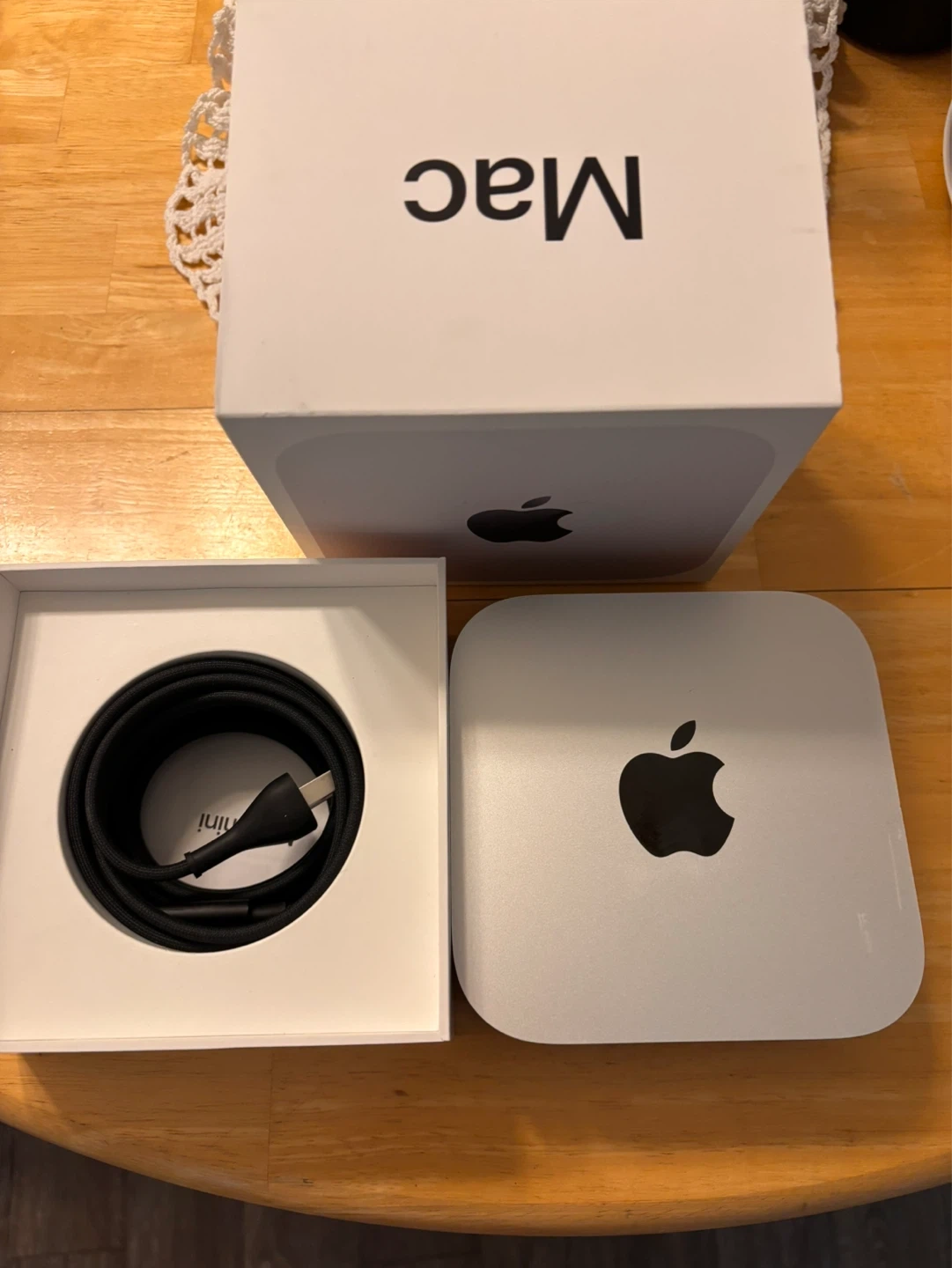 Compact silver Mac Mini desktop computer M4 chip. It includes the main unit and its power cable. Original box is also included, making it great for setup or storage!