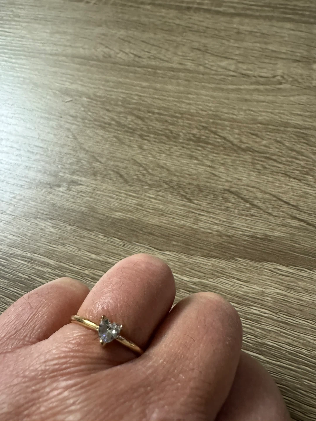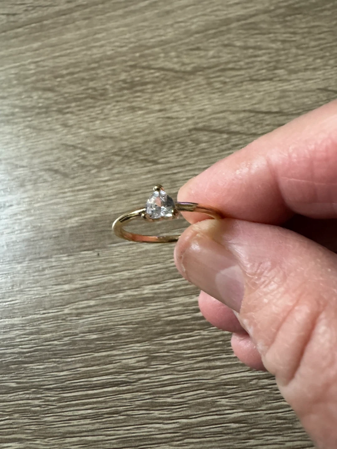 A lovely gold-tone ring featuring a clear, heart-shaped stone. It's a dainty piece that's perfect for everyday wear or to add a touch of sparkle. The band is simple and elegant.