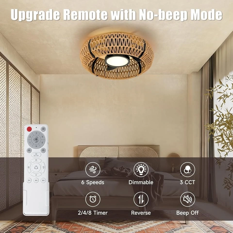 - Remote control with 6 speeds, timer, and no‑beep mode
