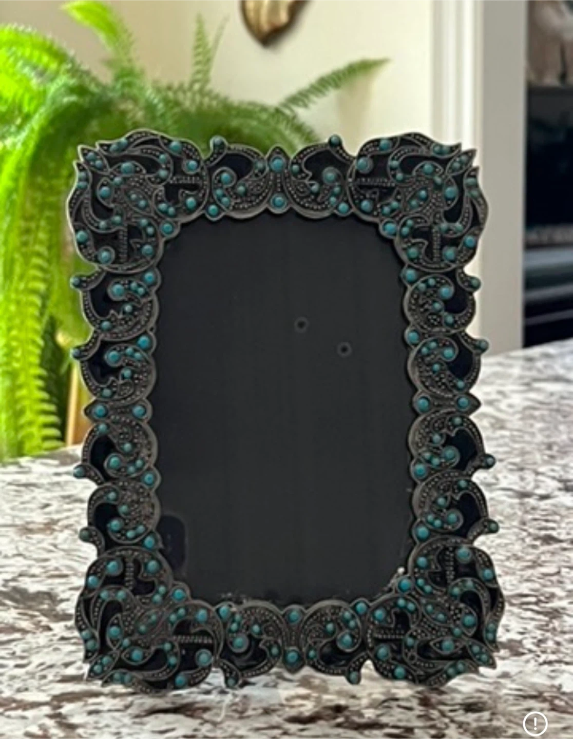 This is a decorative photo frame with an ornate design. It features a black finish with turquoise-like embellishments. The frame's intricate detailing adds a unique touch.