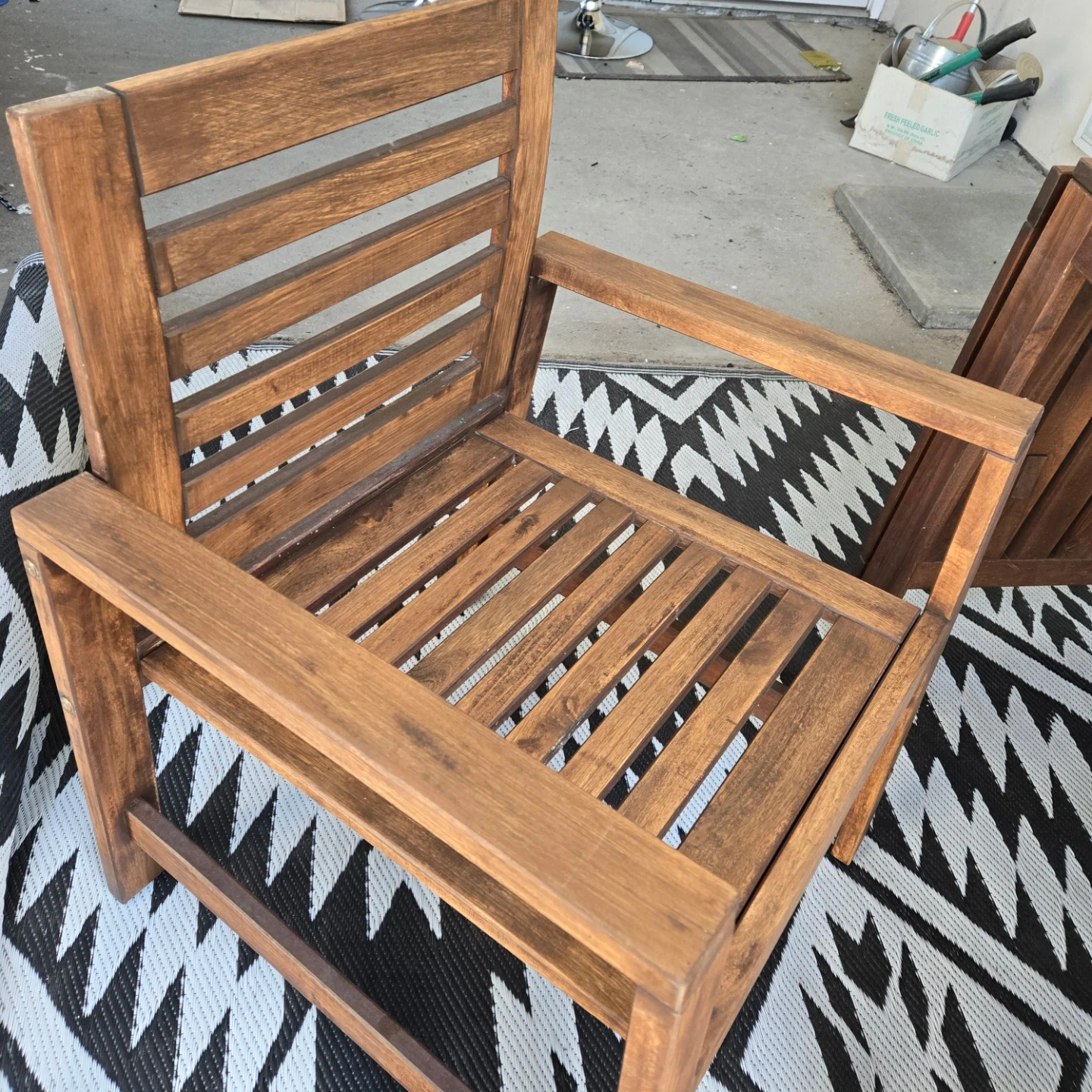 The 2 chairs had been sanded down as well removing the old stain. New stain and sealer has been applied.