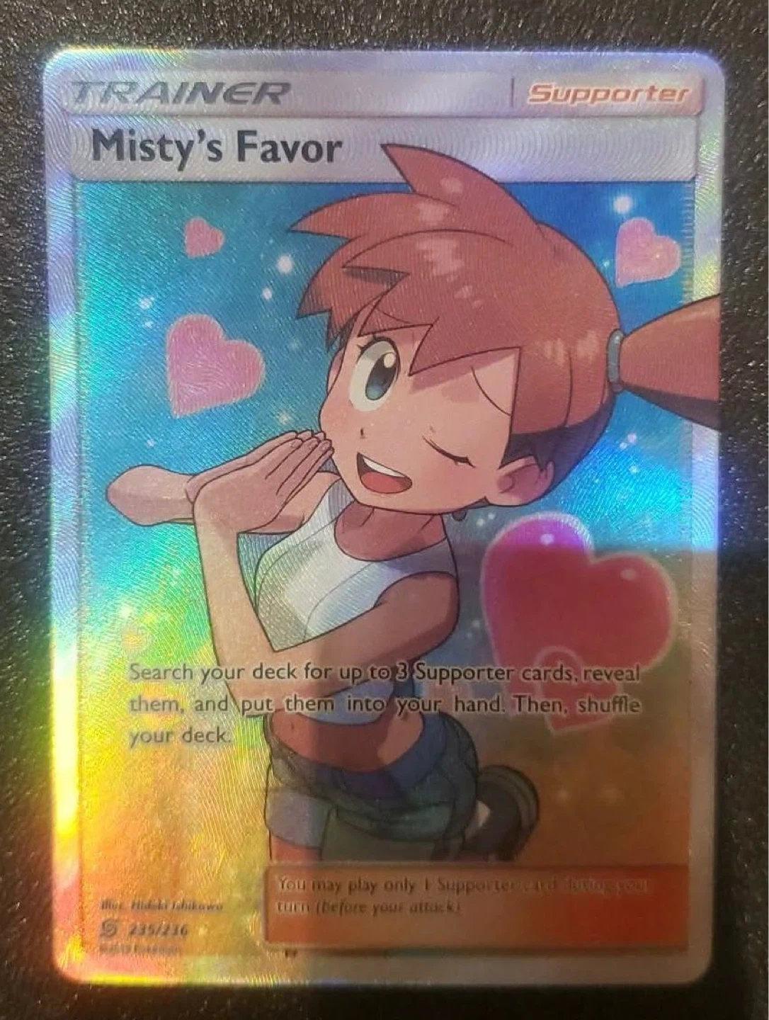Selling a Pokemon TCG Misty's Favor Supporter Trainer card. This card's number is 235/216. It's a full art card featuring Misty. This card allows you to search your deck for up to 3 Supporter cards.