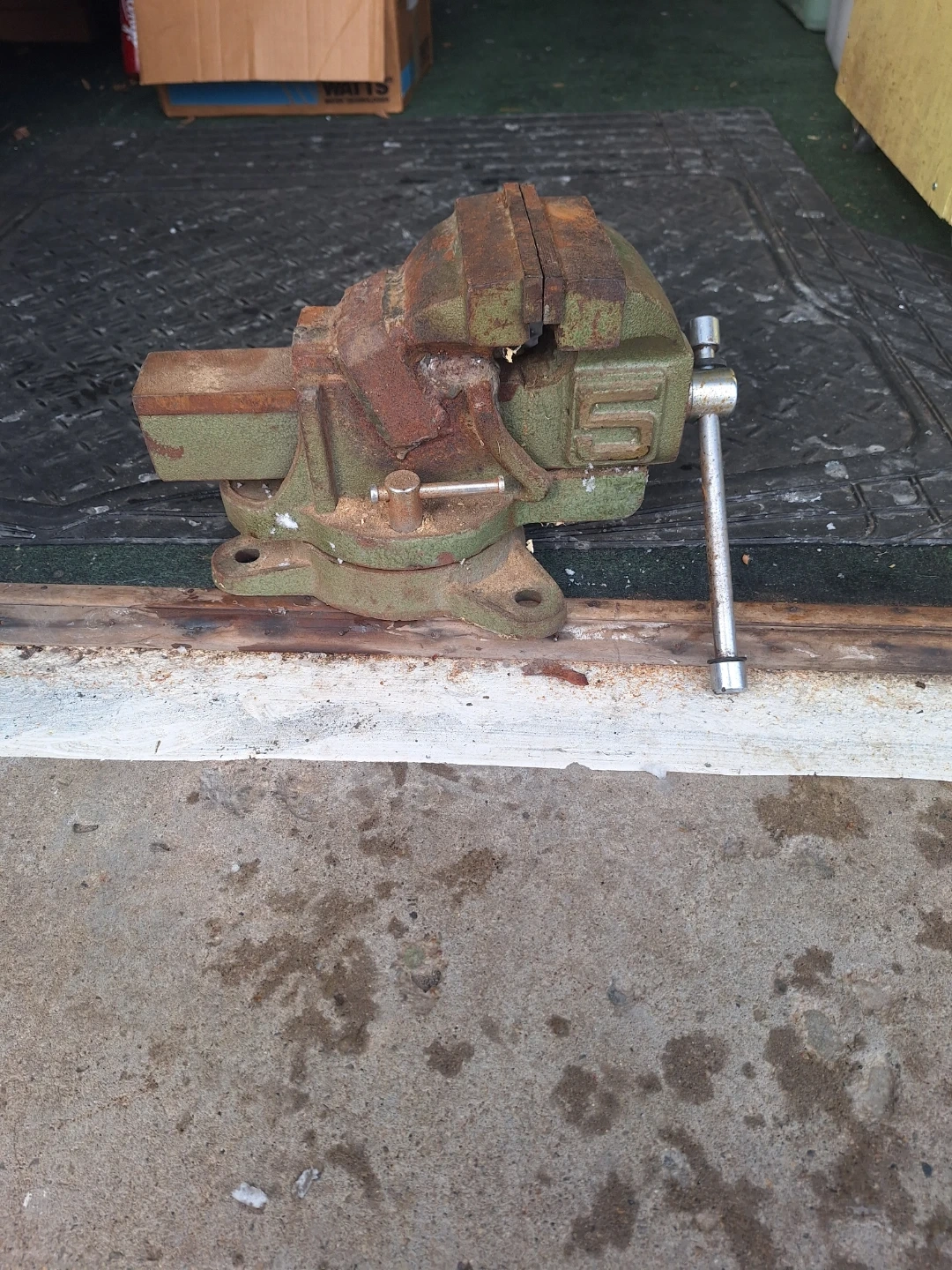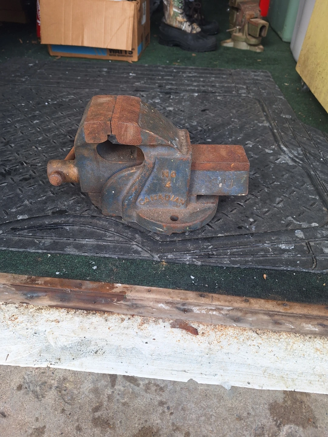 This is a vintage Canadian-made bench vise. It's heavy-duty cast iron construction and features a swivel base. Shows signs of rust and wear consistent with age, but the mechanisms still function. Two for sale $50 each