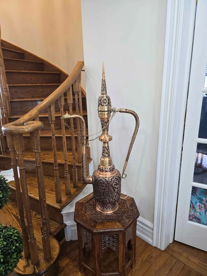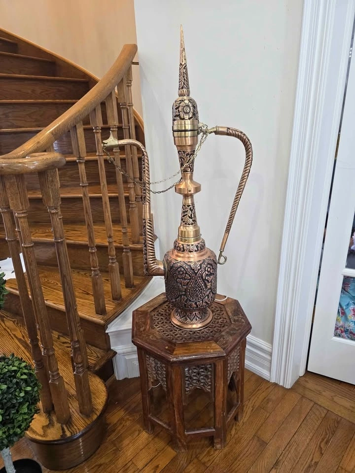 Make a bold statement with this breathtaking, 39-inch tall artisan-crafted floor ewer. Standing nearly 3.5 feet high, this is a rare, grand-scale architectural piece that brings an "Old World" luxury feel to any space. It features intricate, hand-wrought engravings and deep-etched floral motifs across the entire copper body, accented by polished brass rings. At 39" tall, it is perfectly sized to stand on the floor as a focal point in an entryway, a lounge, or beside a fireplace. The rich, dark patina in the recessed etchings provides a beautiful contrast against the warm copper and brass tones, fitting perfectly into Boho, Maximalist, or Global-inspired interiors. Beautiful vintage condition with a sturdy weight and original chain-linked lid.