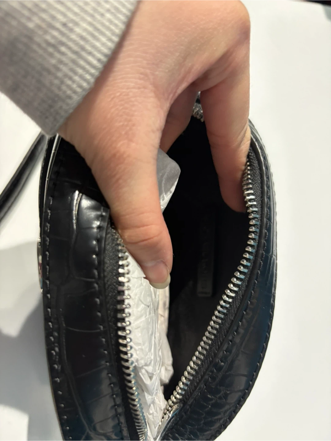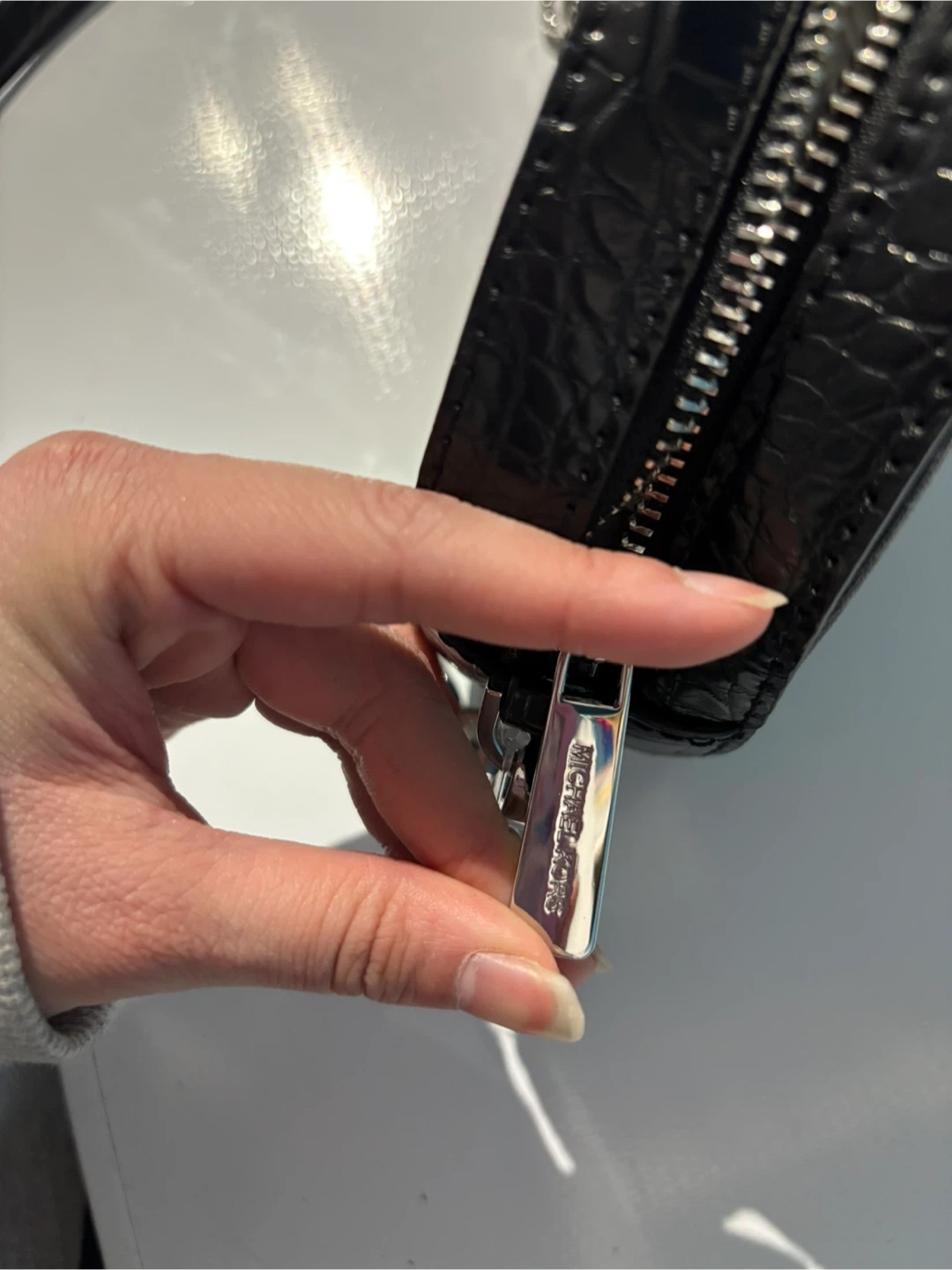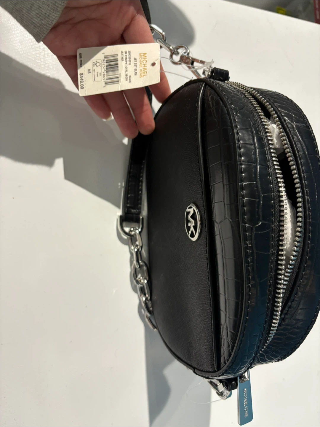 This is a Michael Kors crossbody bag in black. It's made of leather with a crocodile-embossed detail. It features a chain strap and zip closure.