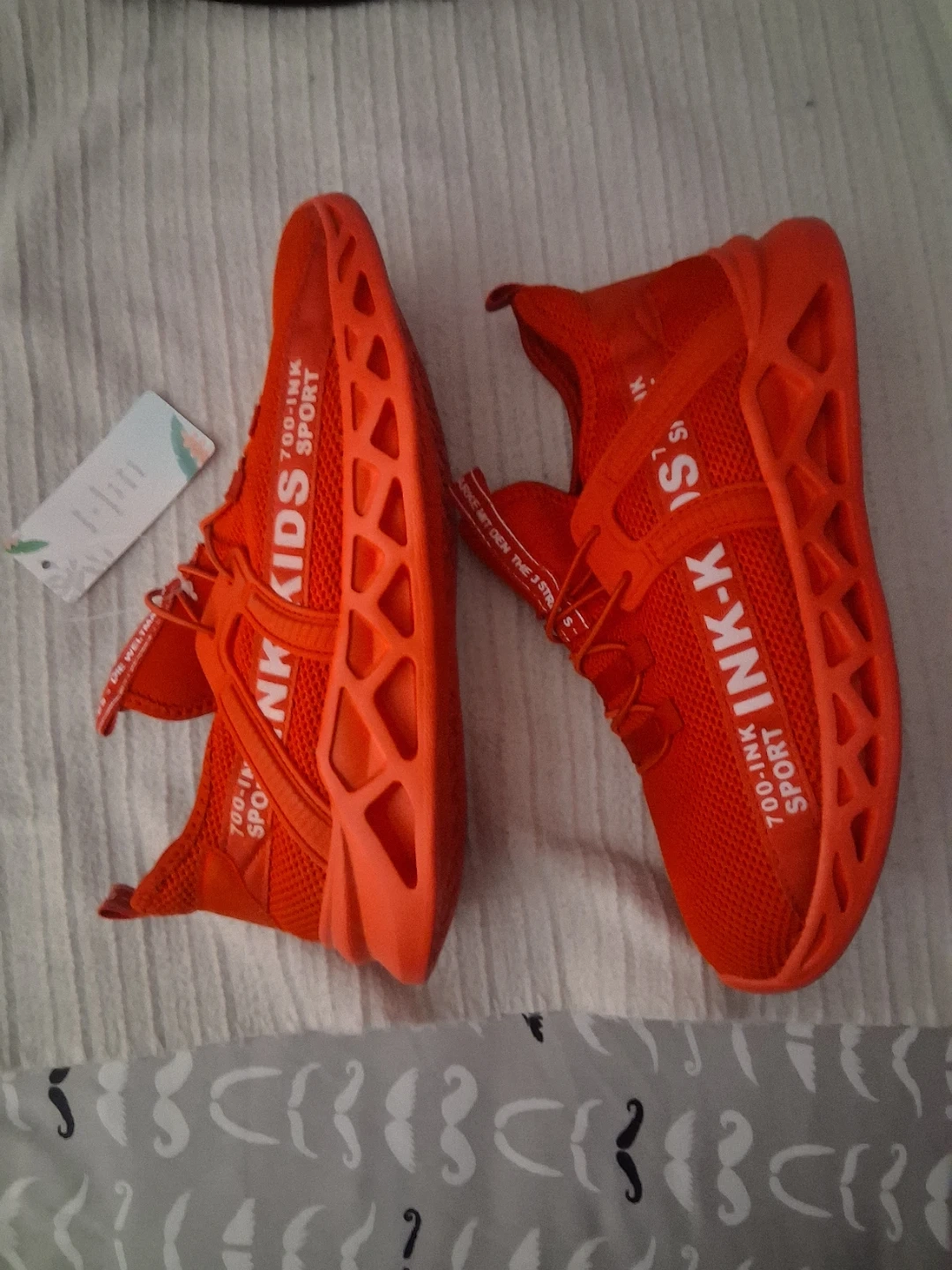 Orange athletic sneakers from QVEKOS. These shoes are a size 38. They feature a breathable mesh upper and a durable sole.