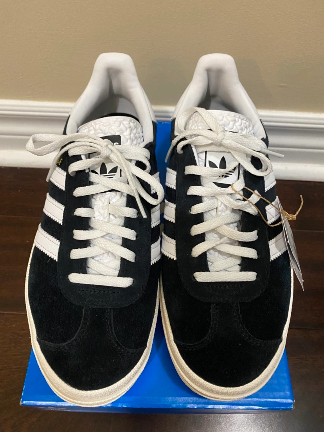 Brand new Women's Adidas Gazelle Bold W sneakers. Black suede upper, white stripes, and off-white platform sole.