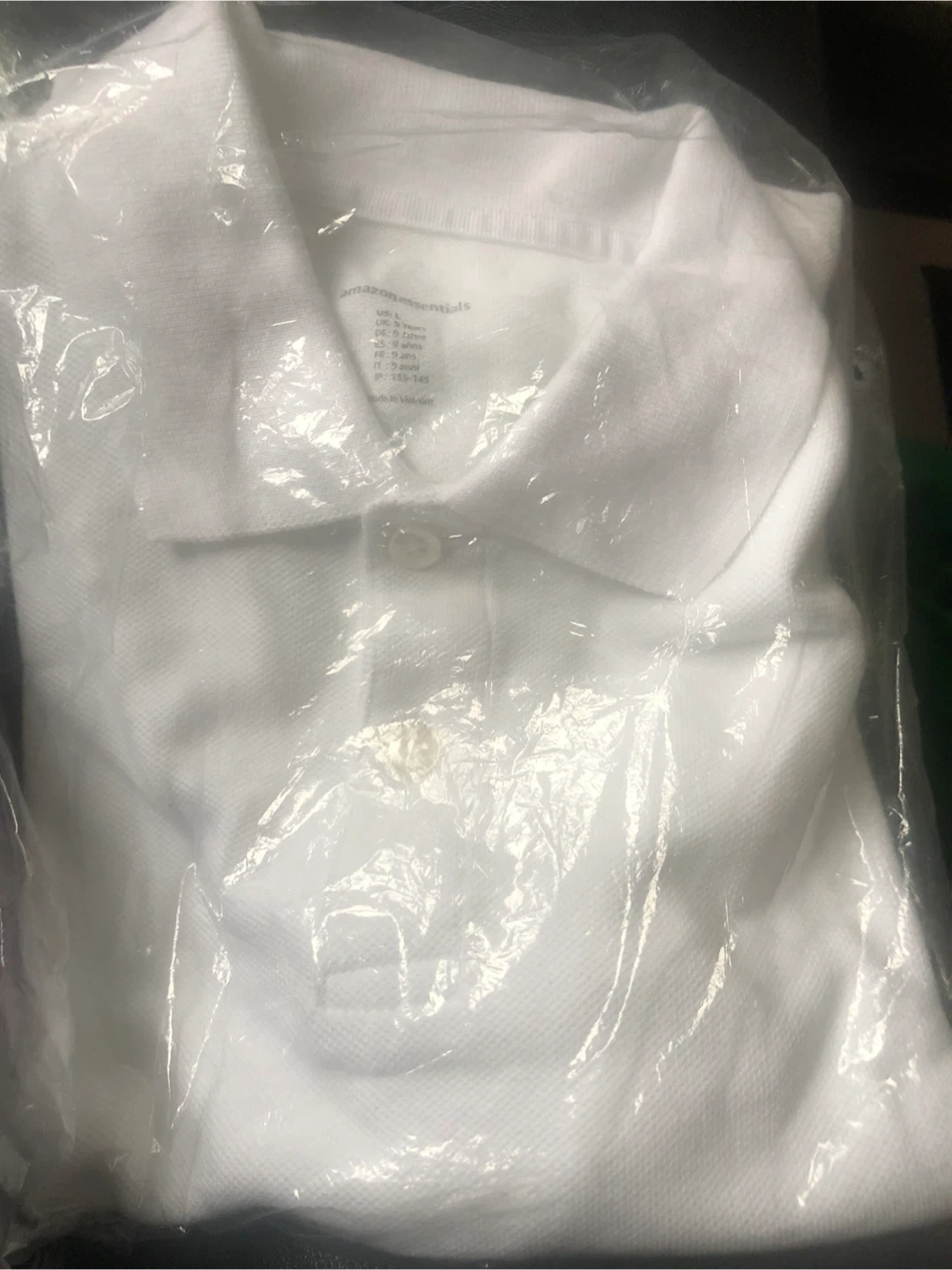 This is a white polo shirt from Amazon Essentials. It's a kids size large. The shirt is made of a textured knit fabric.