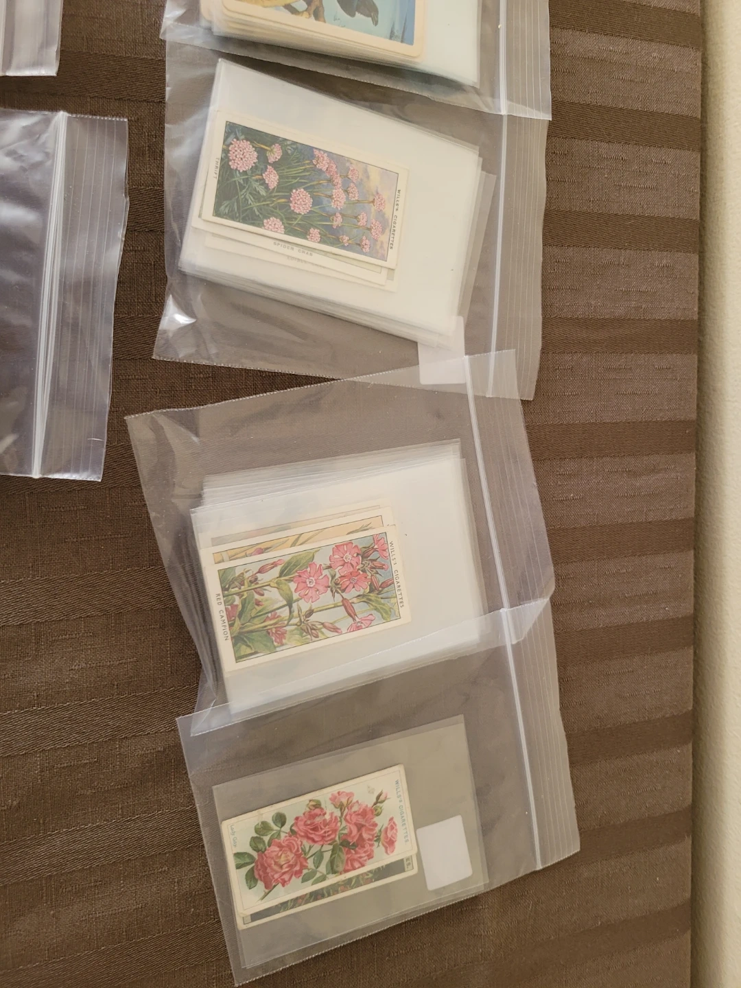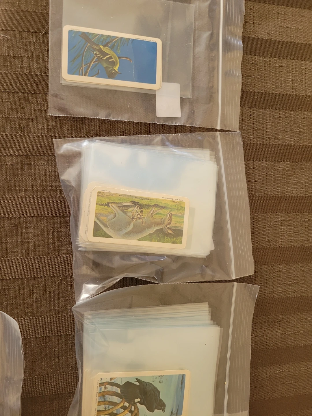 Collection of vintage illustrated trading cards featuring birds, butterflies, and flowers. Cards appear to be from various sets and brands. They're protected in individual plastic sleeves. A neat find for collectors!
