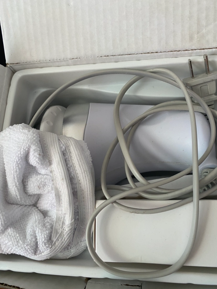 A BYMCF Body Sculpt machine to help you shape your body. Comes with a cleaning cloth. It is corded and uses a standard wall outlet. The machine has several different speeds.