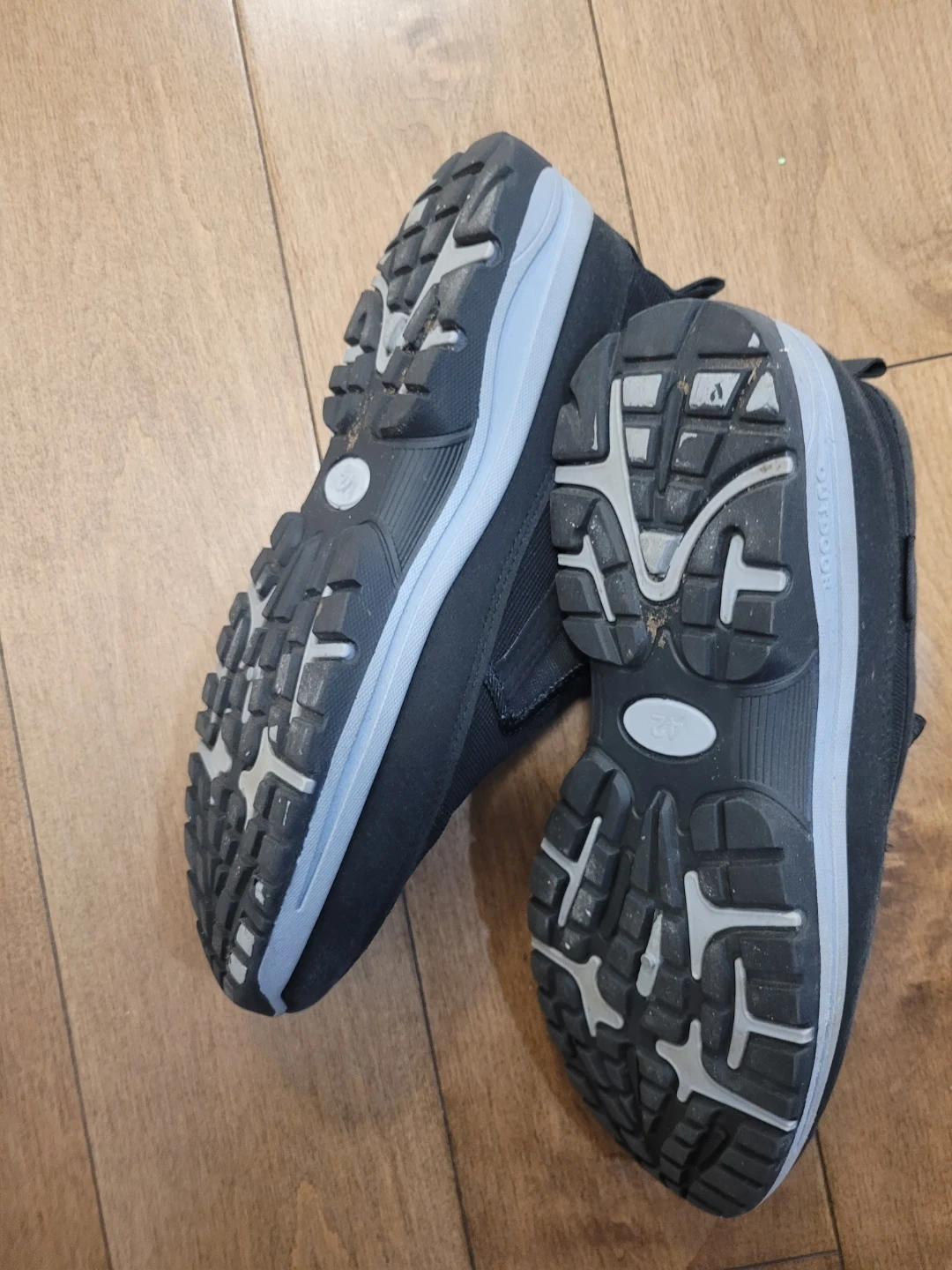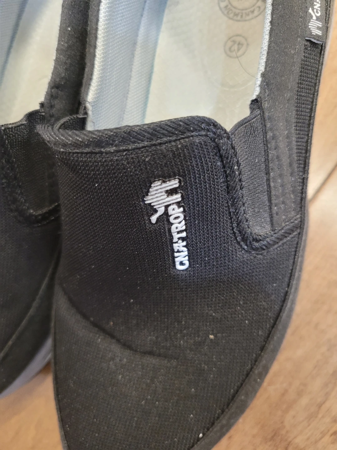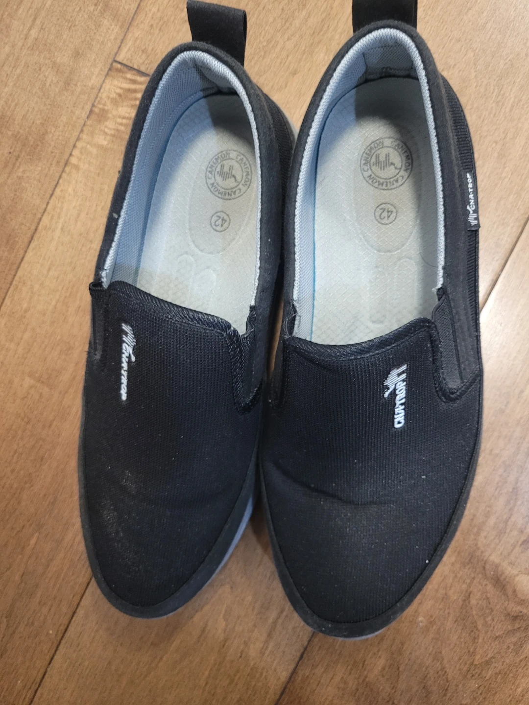 Comfortable black slip-on shoes . Features a durable sole and a fabric upper. Size is 42.