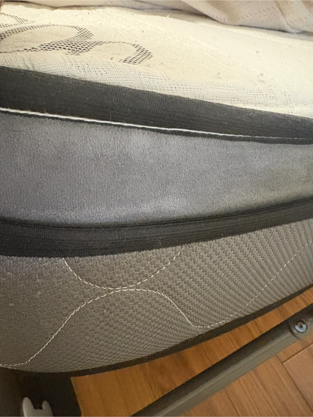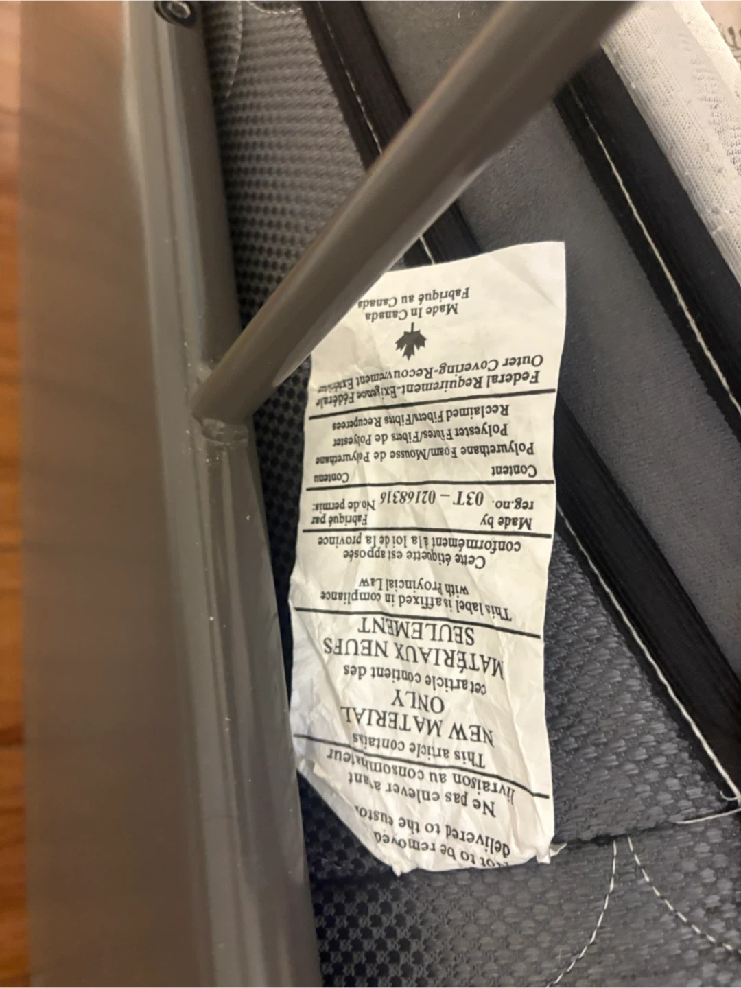 This mattress is made with new material only. It contains polyester fibres/fibres de polyester, polyurethane foam/mousse de polyuréthane, and reclaimed fibre/fibres recycles. It's made in Canada and conforms to provincial law