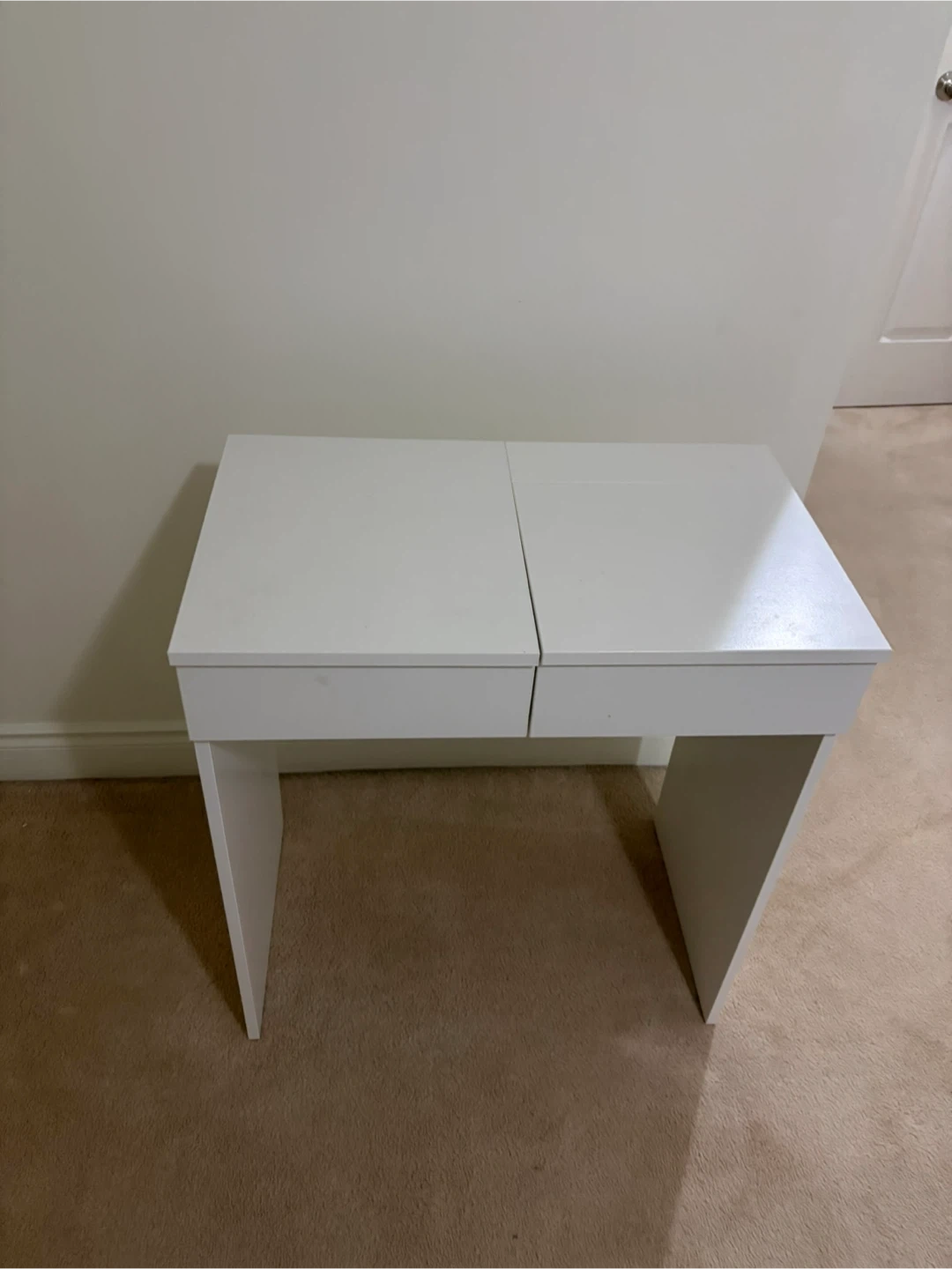 Selling a white vanity makeup table! It features a built-in mirror and drawers for storage. The interior of the drawers is a vibrant red, adding a pop of colour. Perfect for a bedroom or dressing area!