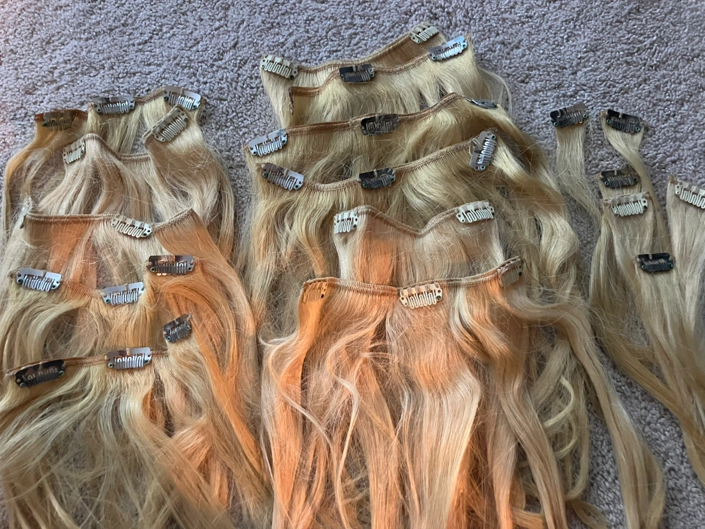 Two colours of clips included: metal and blonde; on a very soft seam. These extensions can be styled, washed, curled or straightened. Single clip pieces and longer (3 clip) pieces included. Length 8-12 inches.