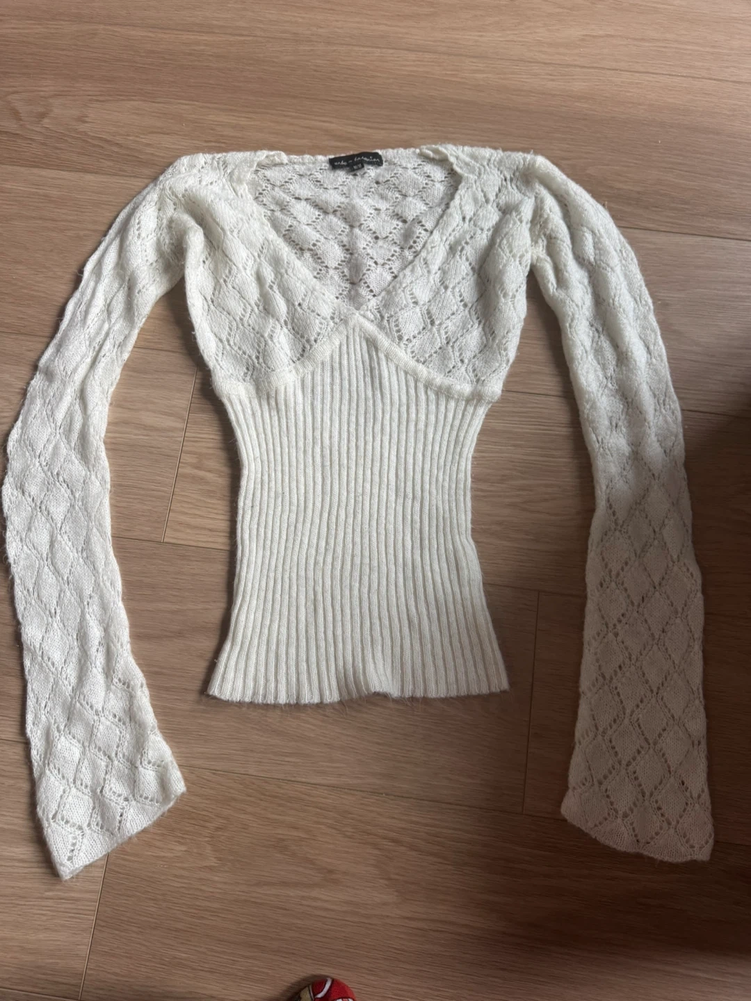 This is a white, long-sleeved knit cropped sweater. It features a lace-like pattern on the upper portion and sleeves, with a ribbed texture on the lower bodice. The neckline is a deep V.