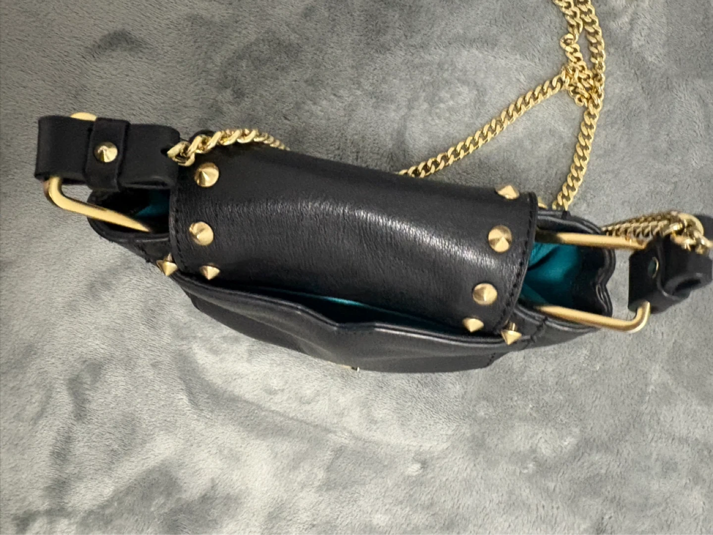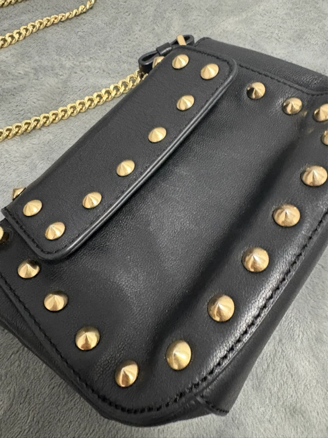 Brian Atwood small studded leather crossbody bag with a gold-tone chain strap.