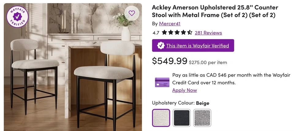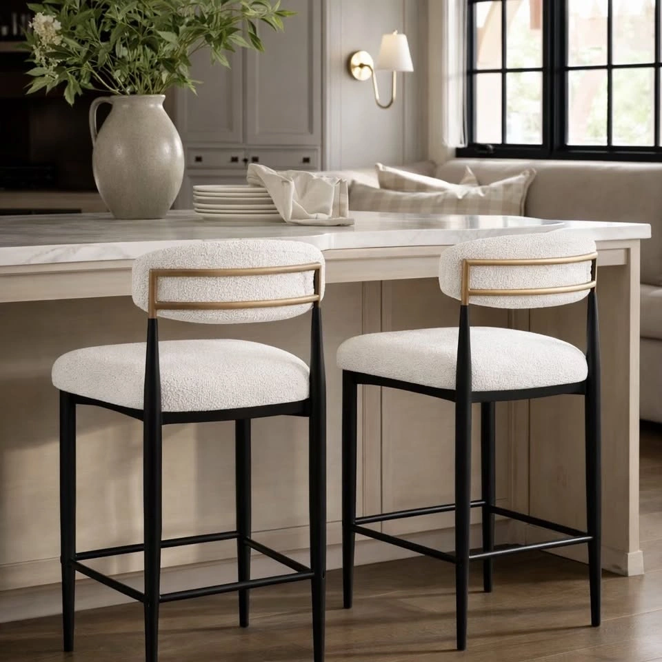 Set of two upholstered mid century modern (MCM) boucle counter stools with a metal frame, comfortable cushioned seats and foot rests. Brand new in box. Price listed is for the set of 2.