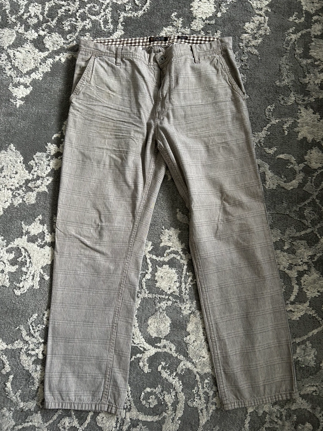 Khaki color plaid casual pants. Men's size W36 L30. 100% cotton. Features a button closure and pockets. (Bought from The Bay)
