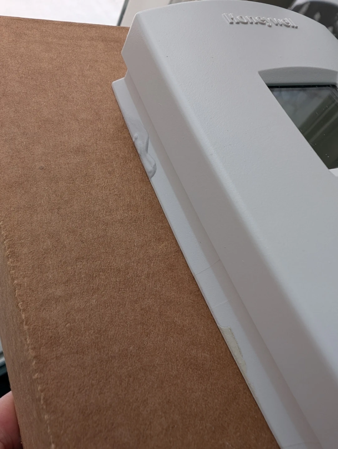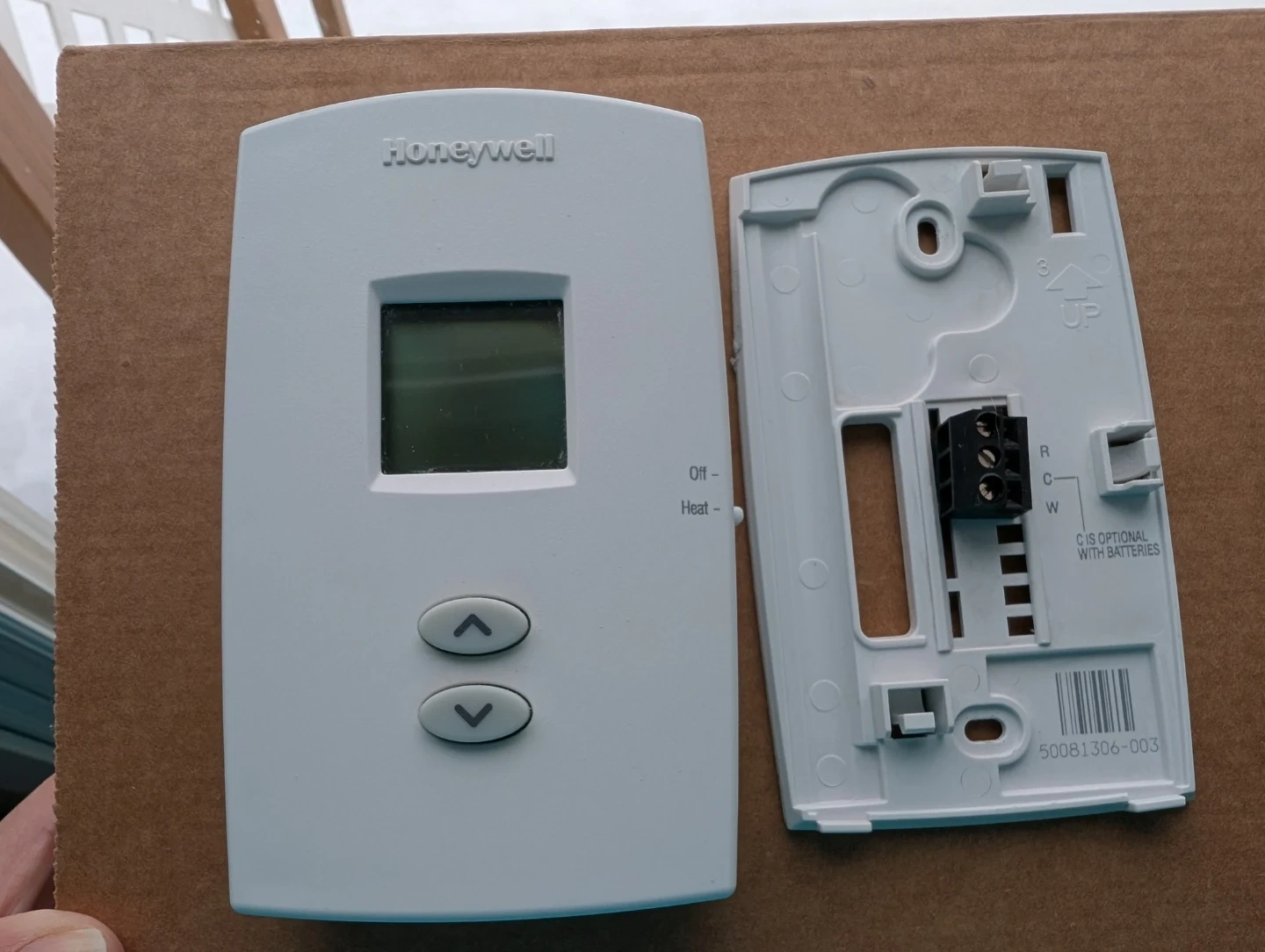 This is a white Honeywell thermostat. It features a digital display and up/down arrow buttons for temperature control. Includes mounting base and wiring terminals. Used. *Does have a bit of primer on the side as shown in the photograph above.