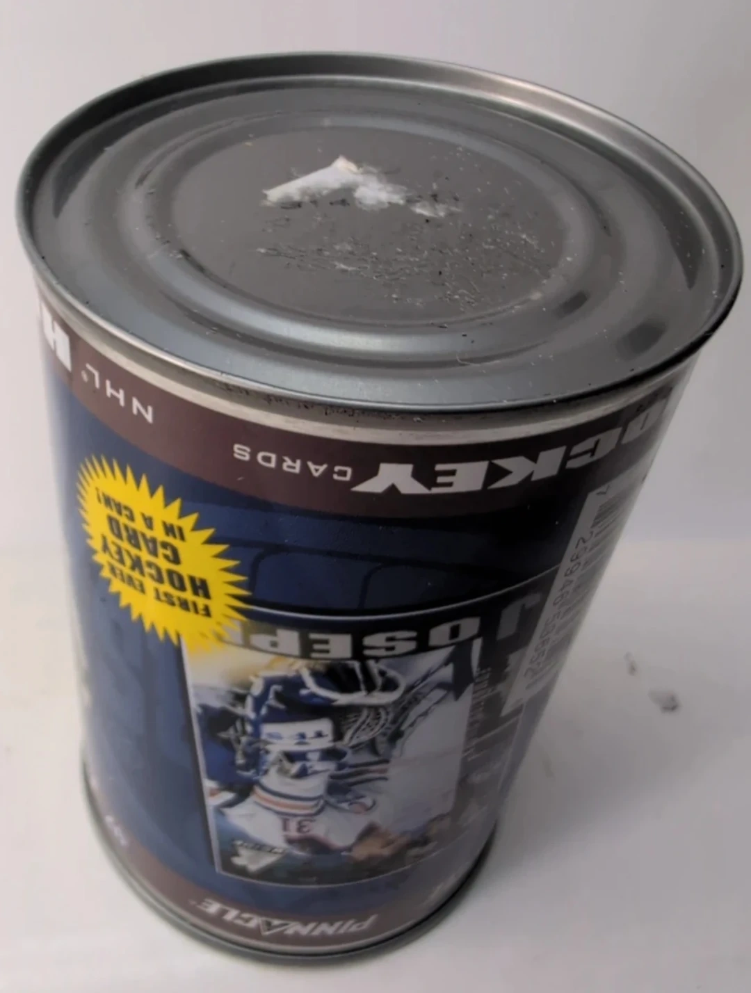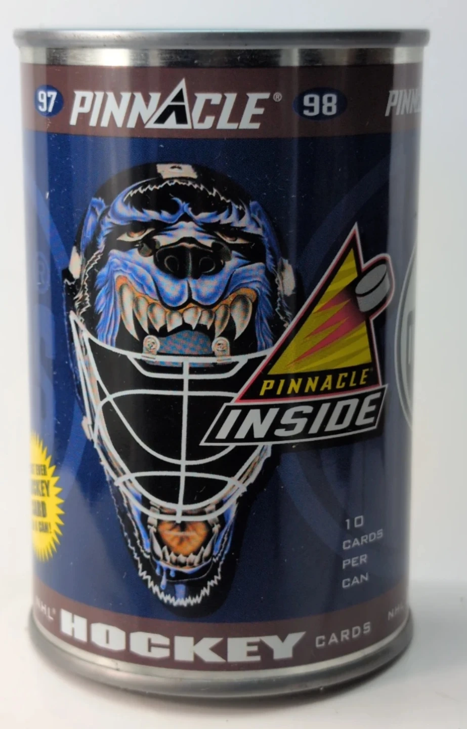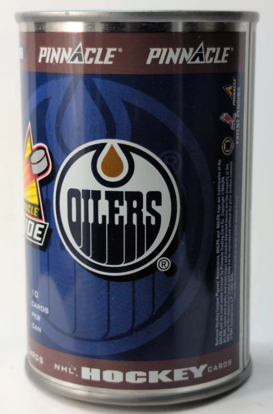 This is a 1997-98 Pinnacle NHL hockey cards can featuring the Edmonton Oilers. Each can contains 10 cards. It also includes a special "First Ever Hockey Card in a Can!".