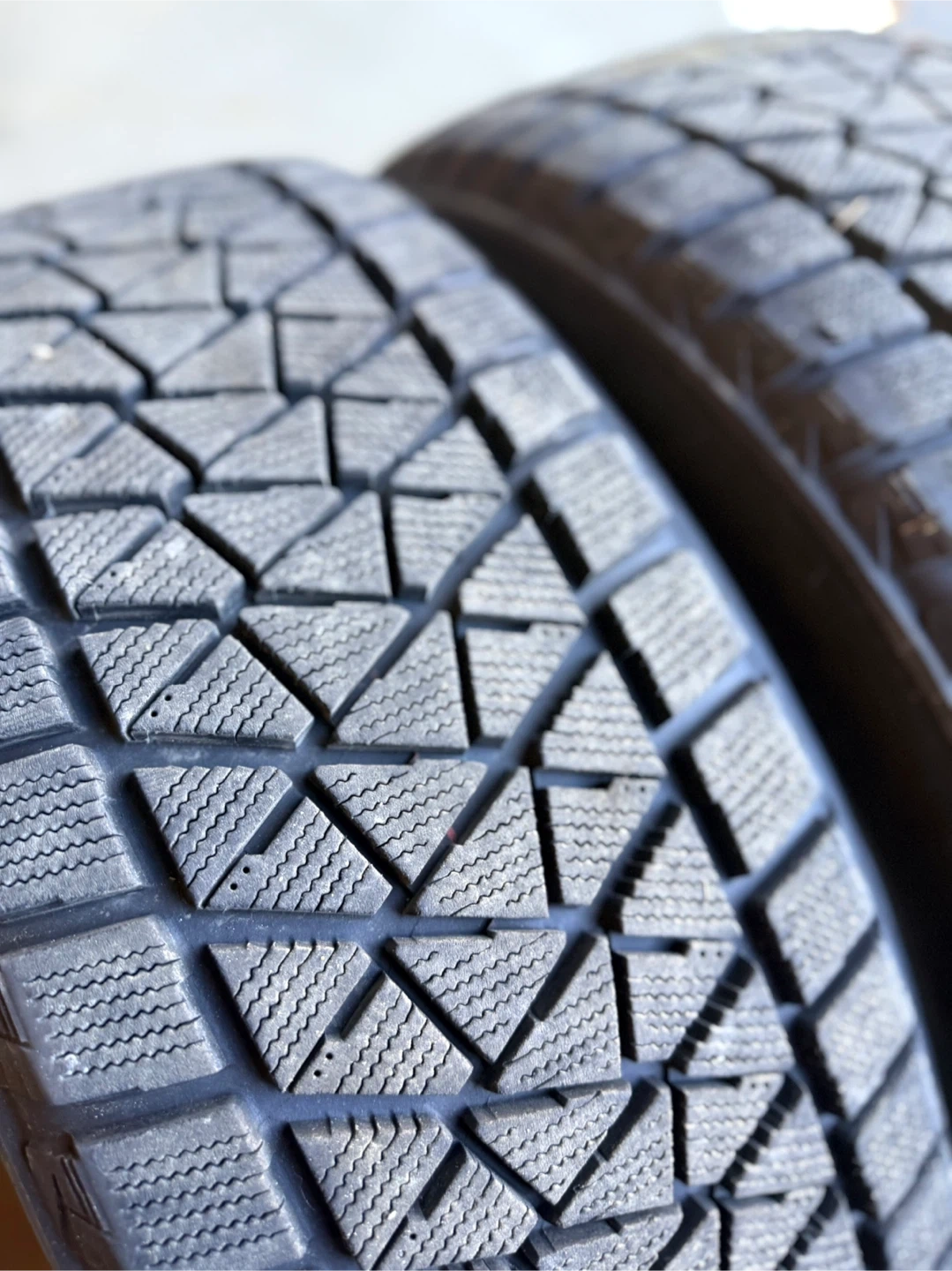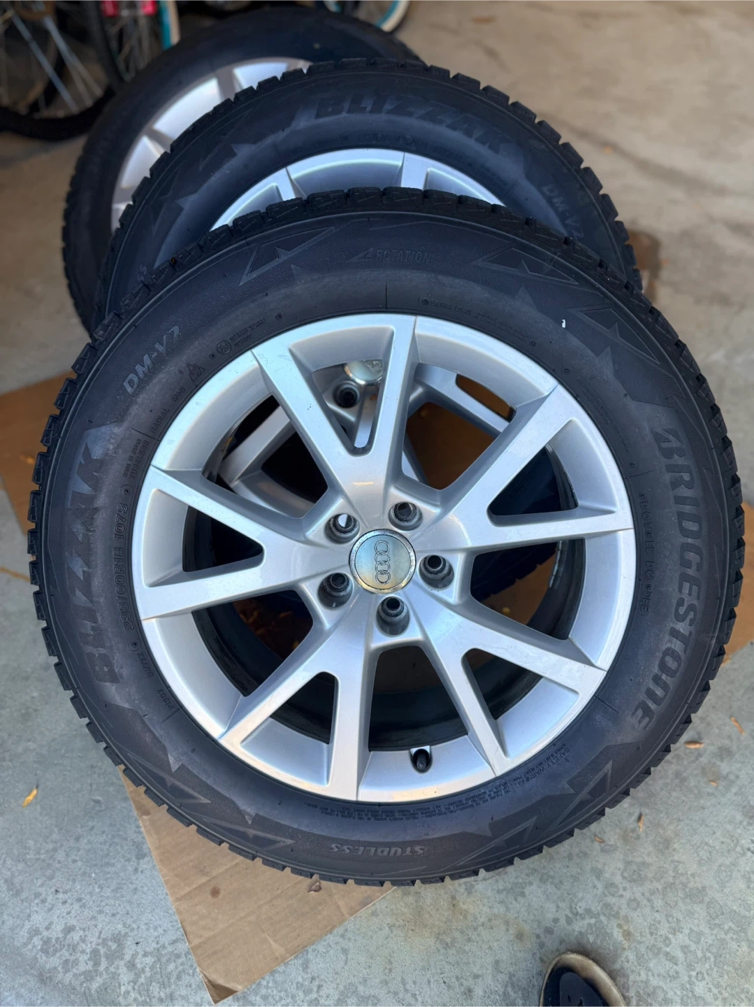Selling a set of Audi rims paired with Bridgestone Blizzak DM-V2 tires. The tires are size 225/55R18. They show signs of wear and some damage to the rims, as seen in the photos. Great for winter driving!