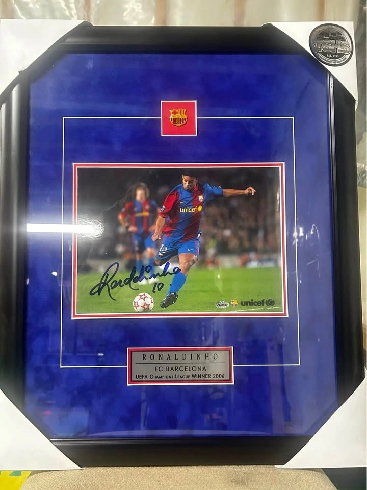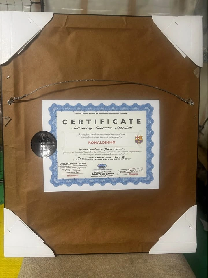 This autographed Ronaldinho portrait from 2006, certified by UNICEF, is a unique collector's item. The permanent blue marker signature and custom framing with UV protective glass make it a beautiful display piece.