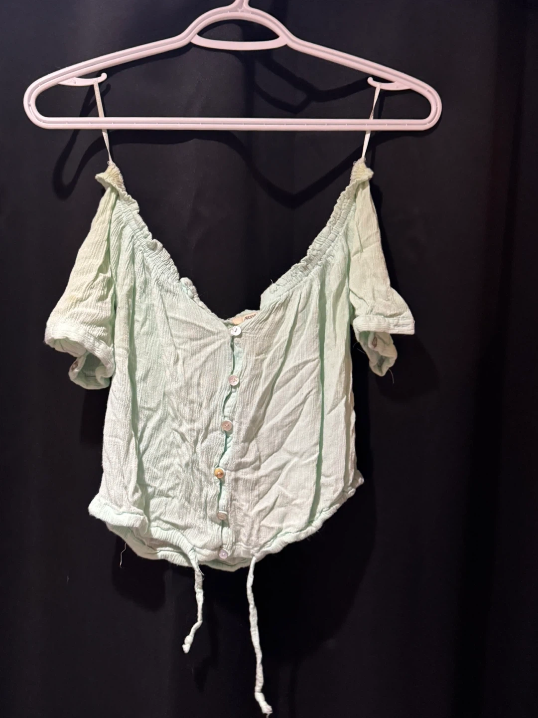 Light blue off-the-shoulder top with short ruffled sleeves and a button-up front. It's made from a crinkled fabric and has a drawstring tie at the hem. This top would be perfect for a summer day out!