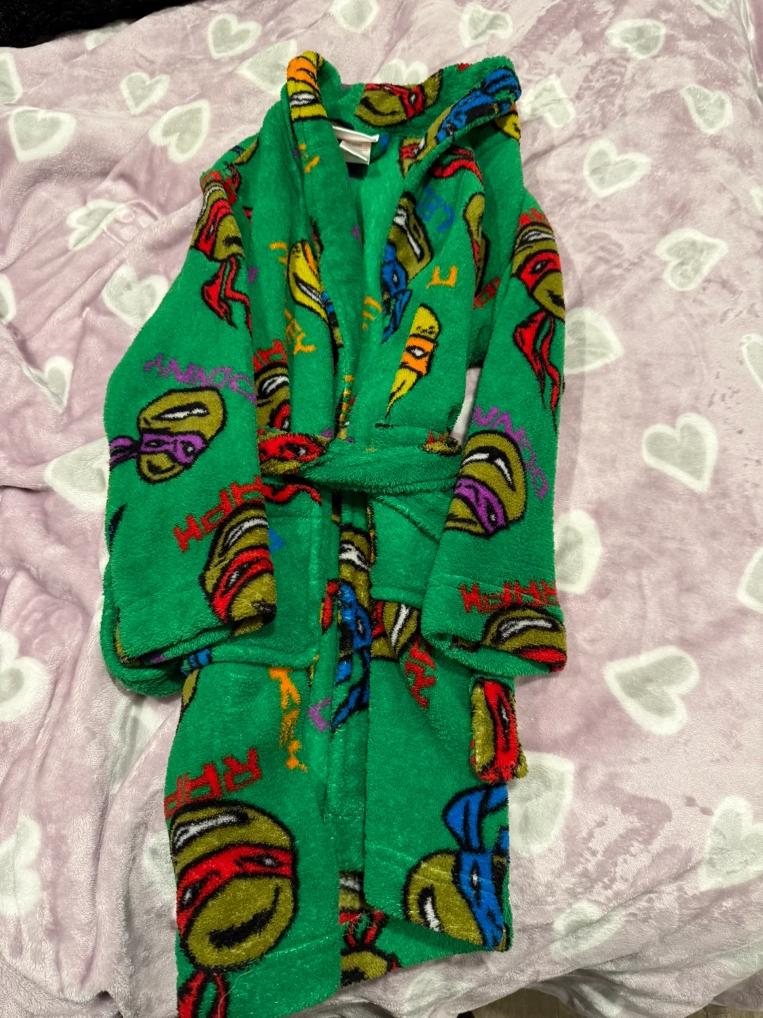 21Cozy up with this fun Teenage Mutant Ninja Turtles bath robe! It's green and features all four turtles. Perfect for after bath time or lounging around the house! Good used condition. Size 6