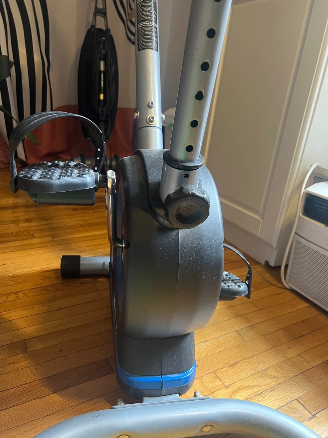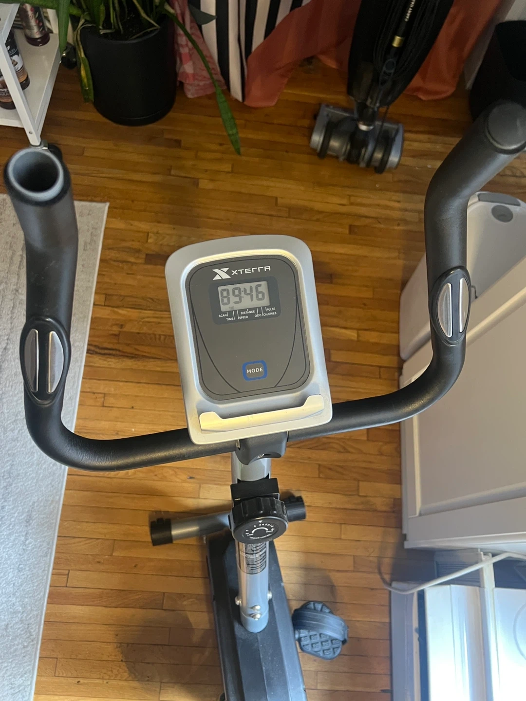 XTERRA stationary exercise bike. Features a digital display for tracking workouts. Adjustable seat and handlebars for customized comfort. Resistance knob allows for varied workout intensity. Will require 2 people to move.