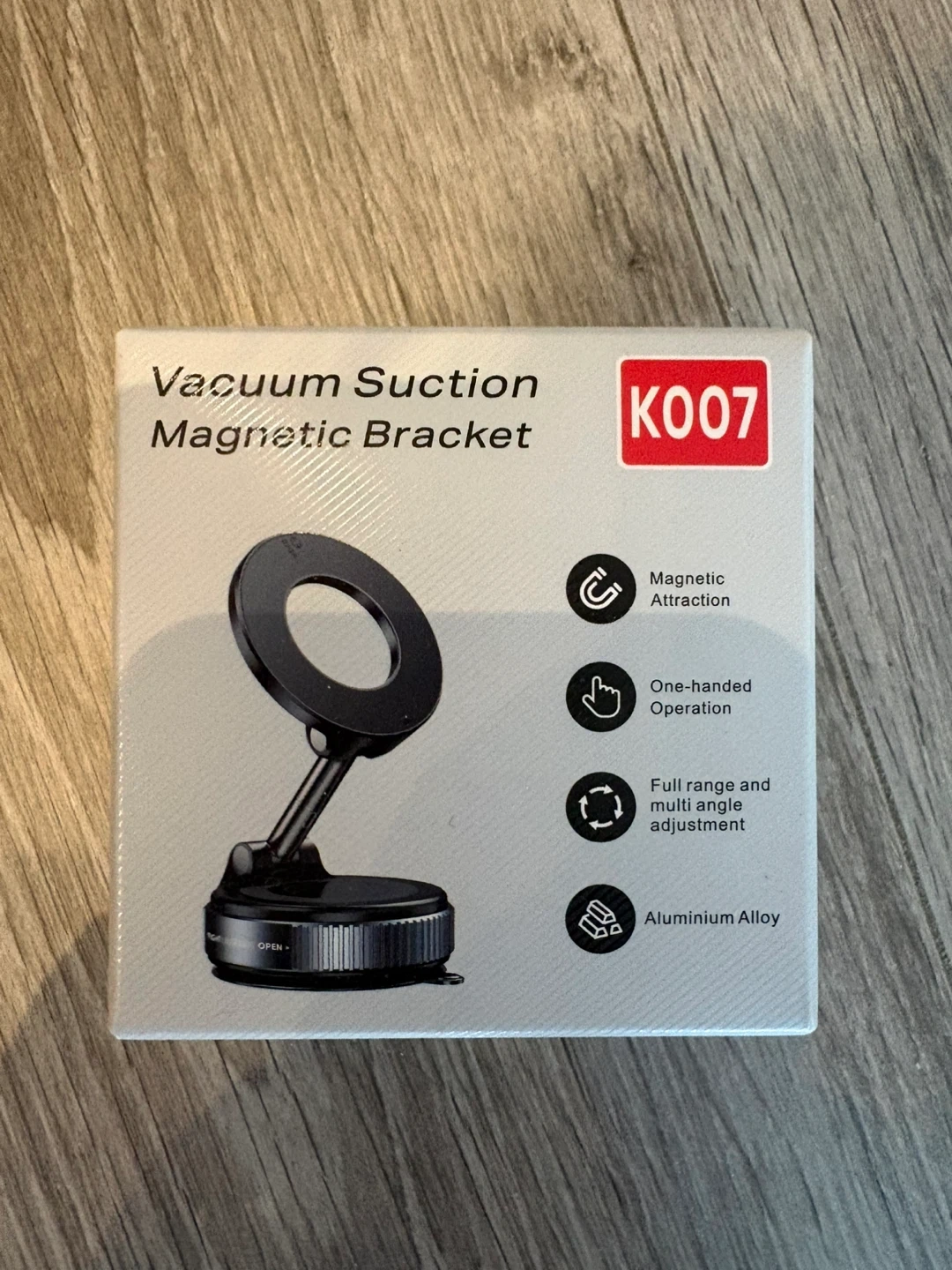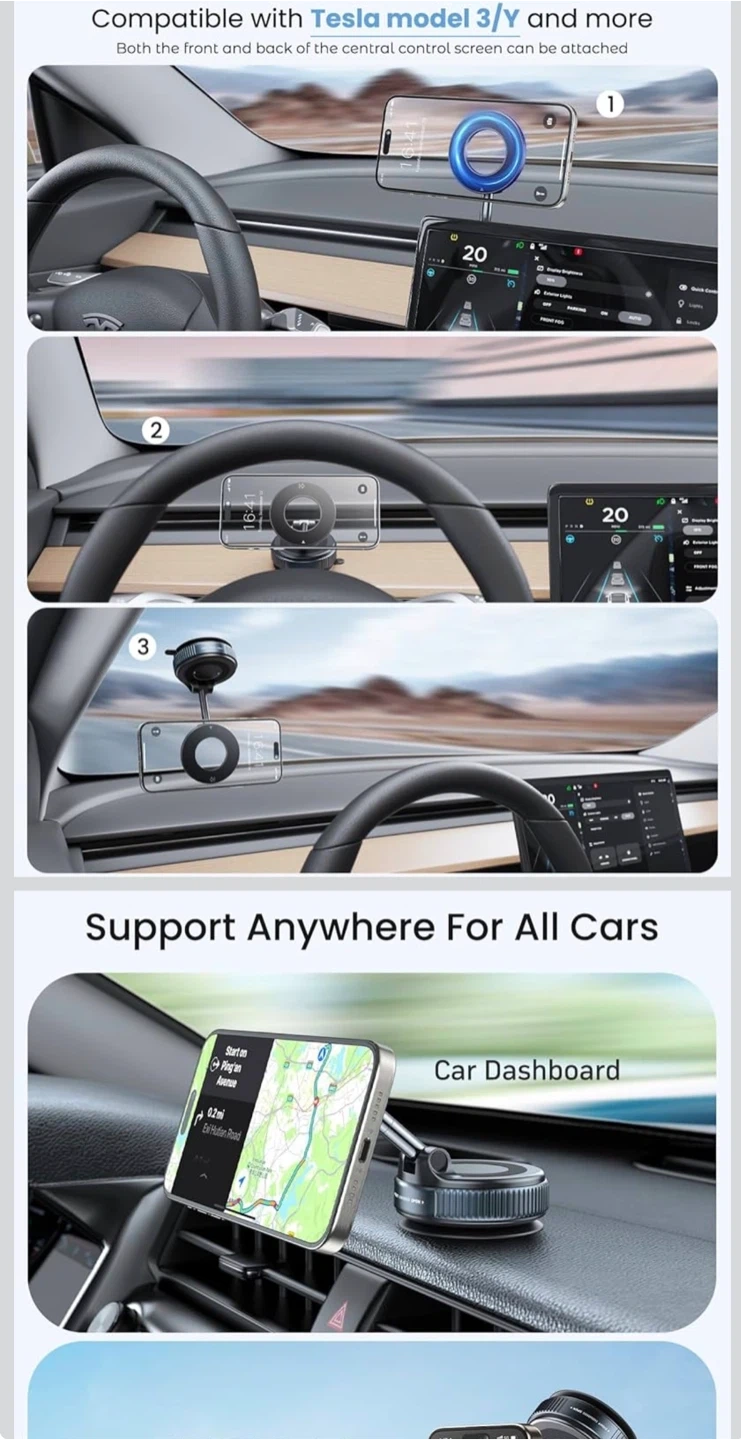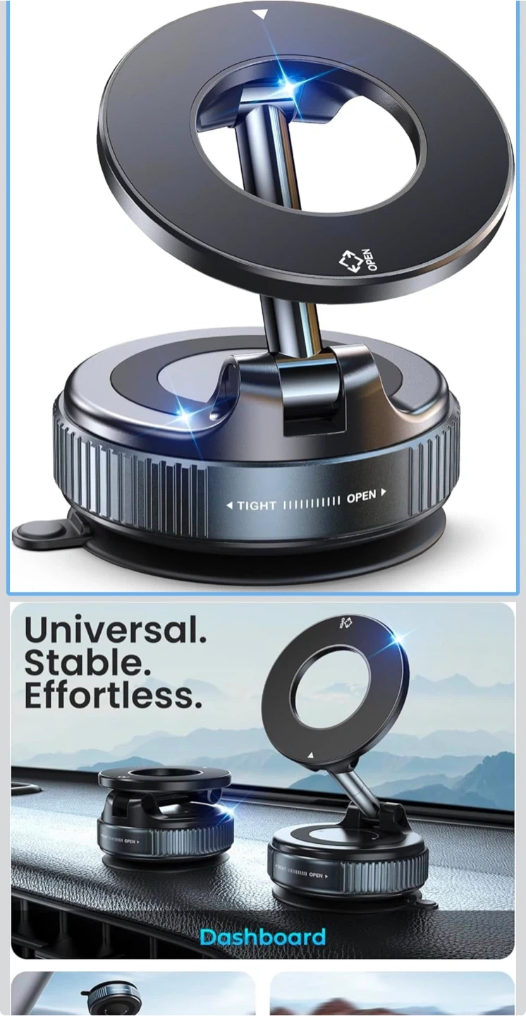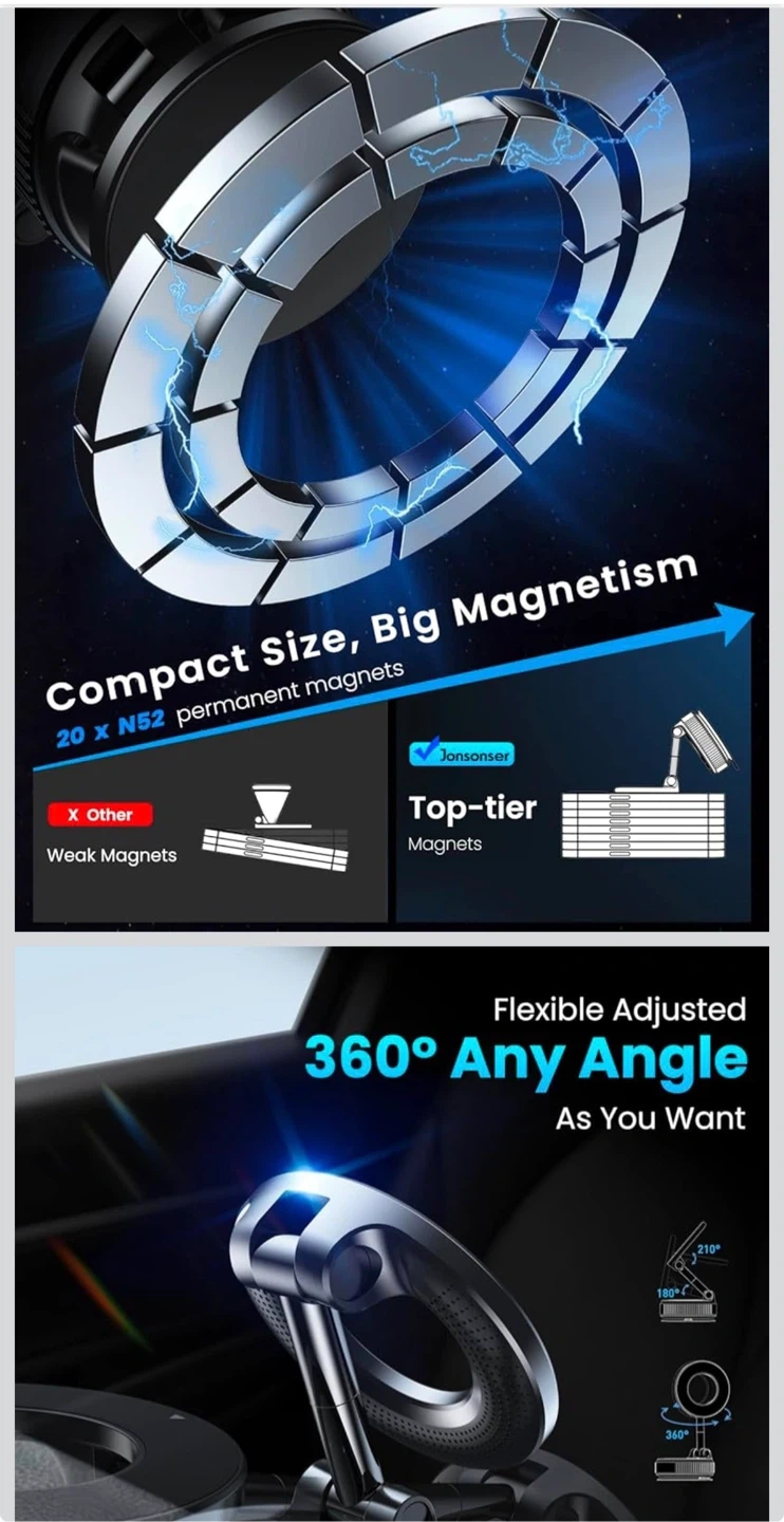This Jonsomer K007 phone bracket features a vacuum suction base for secure mounting. It offers magnetic attraction and one-handed operation. The bracket is made from PC+ABS+TPU, Metallic Paint, and Zinc Alloy. It allows for full range and multi-angle adjustments.