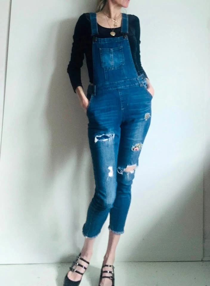 Vintage Fitted Overalls Cotton Denim with Stretch Cute Patches