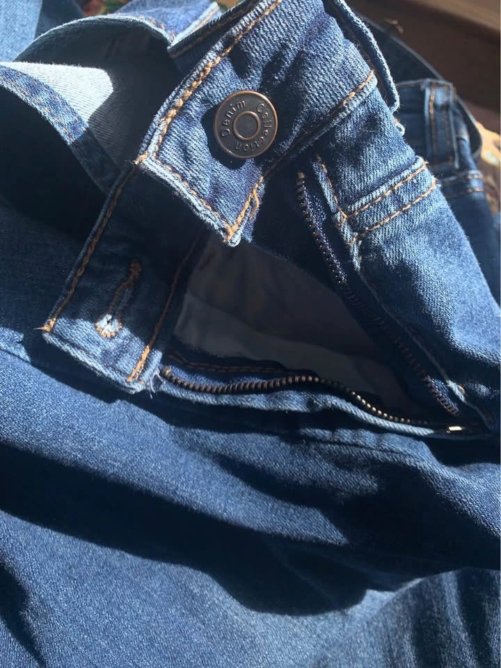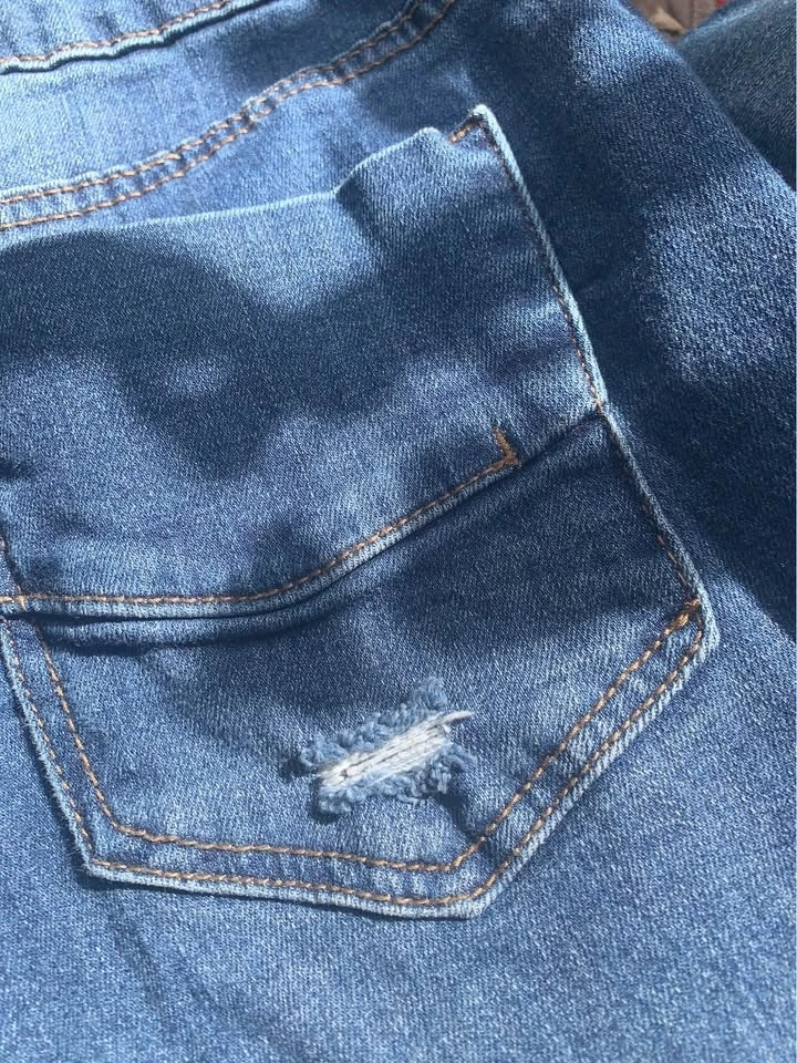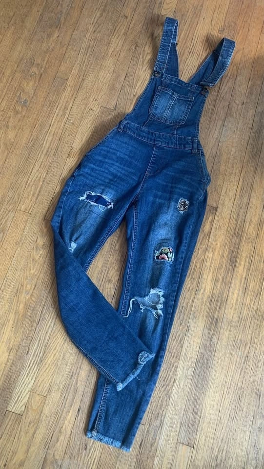 Sweet vintage denim overalls. They are very comfortable, nicely distressed with sweet little patches. Features a pocket on the front bib as well as the back. Excellent shape, very clean. These are cotton denim with cotton patches, meant to be a slim fit, not baggy. Bib pocket and pockets on backside. Nice raw hem. Waist 14.5” laying flat (29” around), inseam 25” (meant to be at ankle-ish, or to floor if you are shorter), rise 10”. Seems a bit of stretch. Super cute.