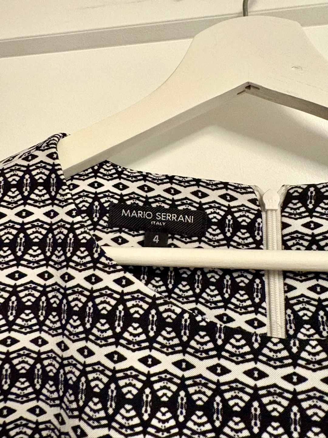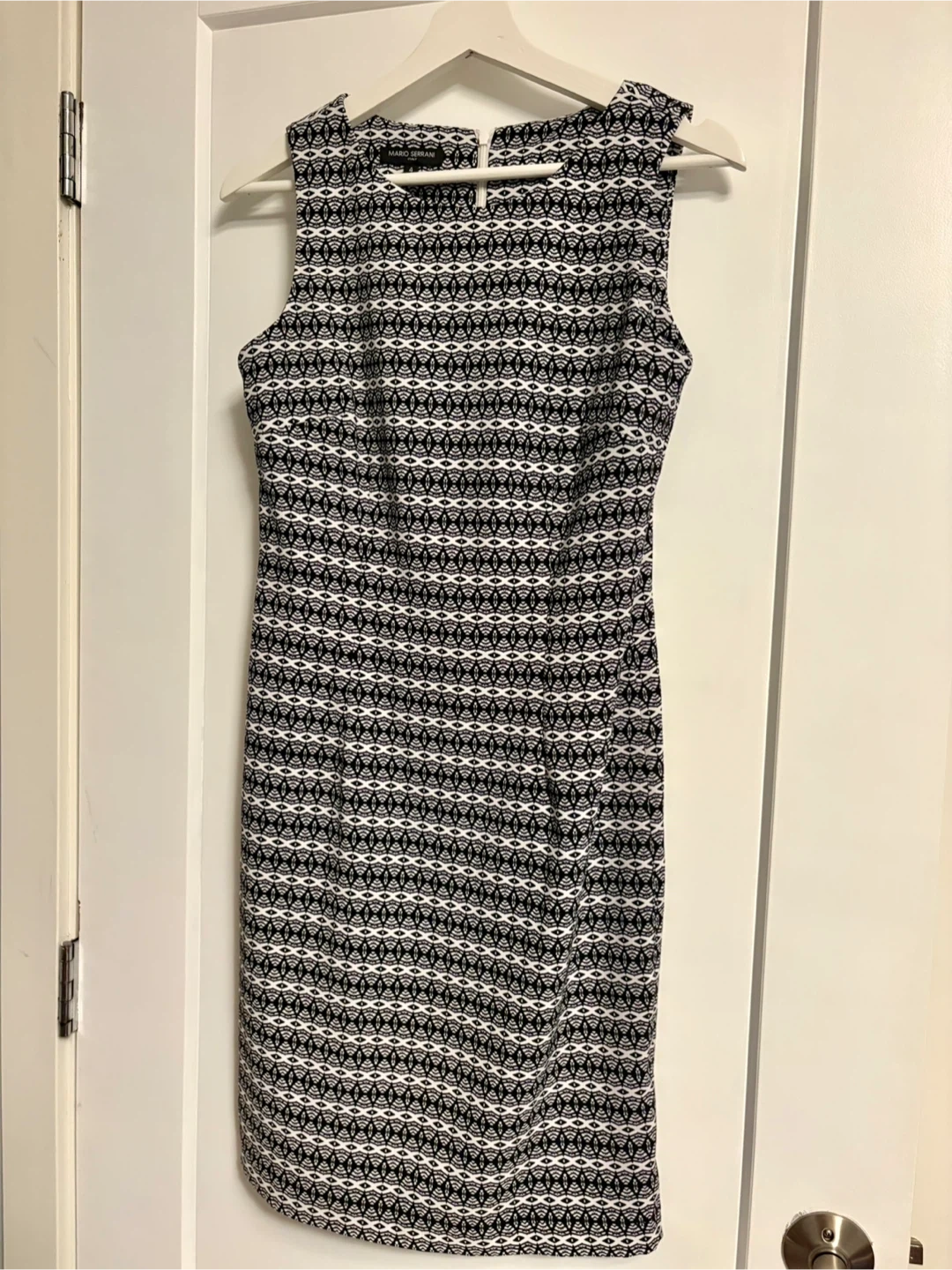 This Mario Serrani sleeveless dress features a black and white geometric pattern. It's a size 4, made in Italy. The dress has a back zipper closure.