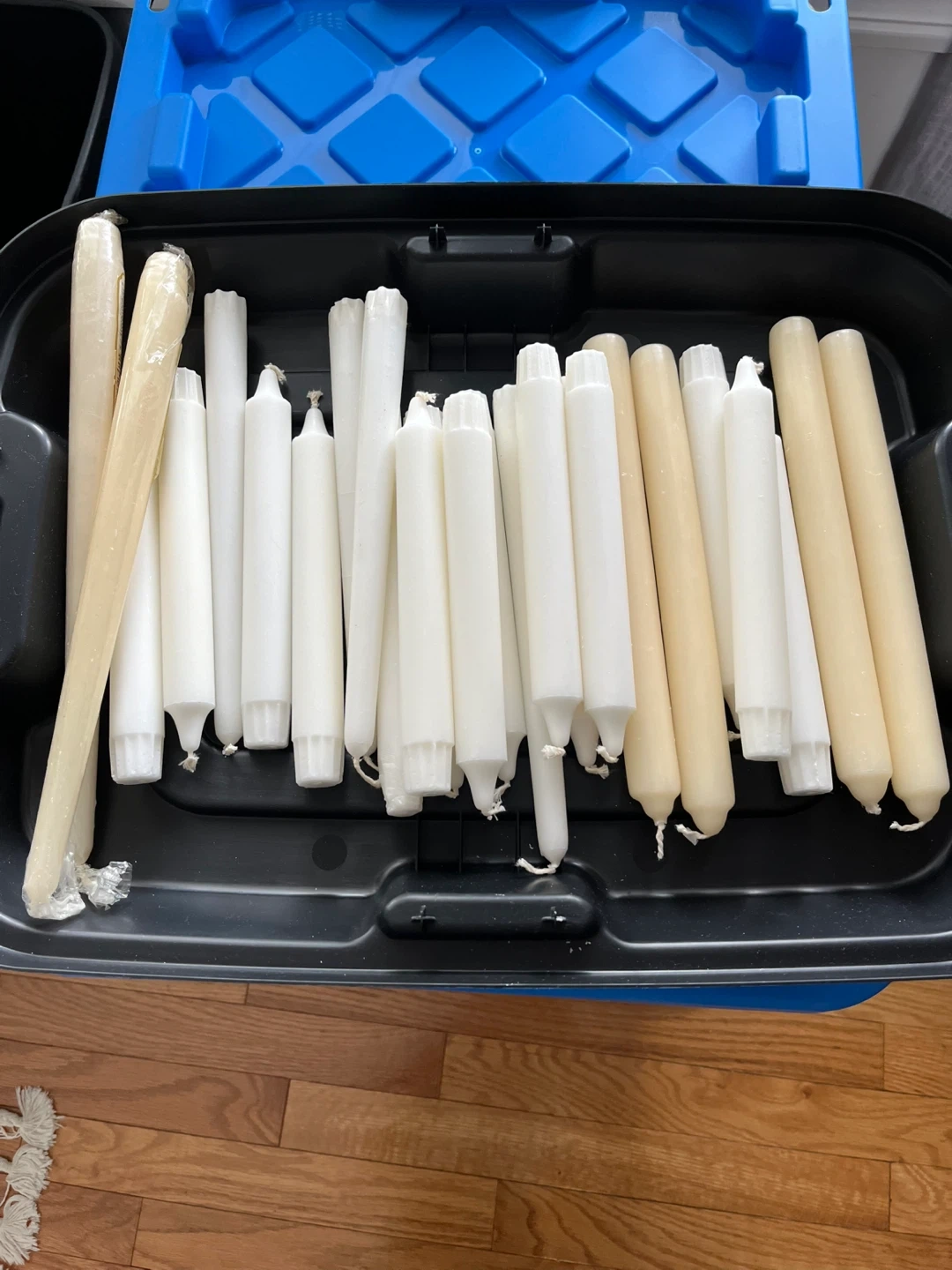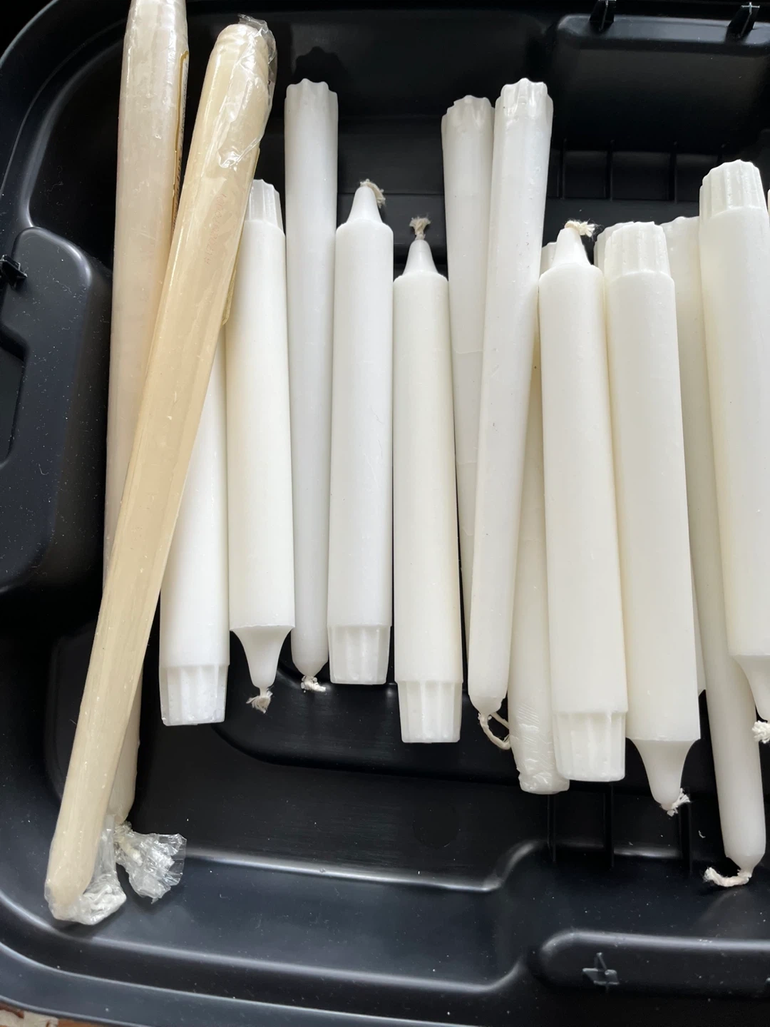 A bulk lot of taper candles in white and beige. There are approximately 25 candles of varying lengths. They're suitable for dinners or decorative use.