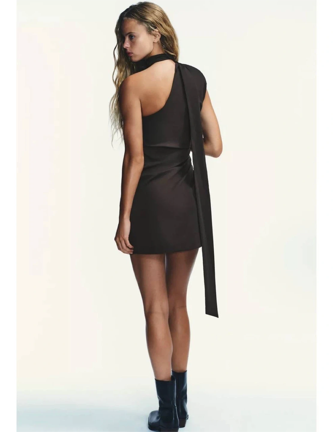 Chic and modern mini dress from ZARA featuring an elegant asymmetric design with a built-in scarf detail. A sleek, minimal piece that creates a stylish, fashion-forward silhouette—perfect for evenings, events, or going out.