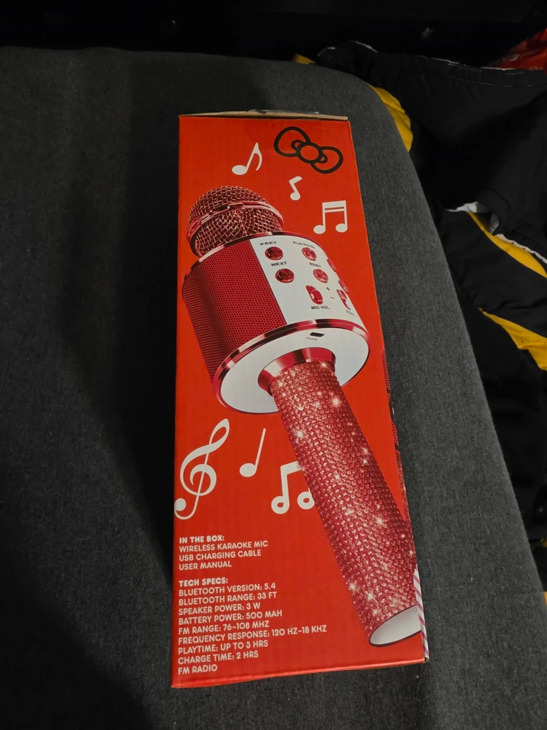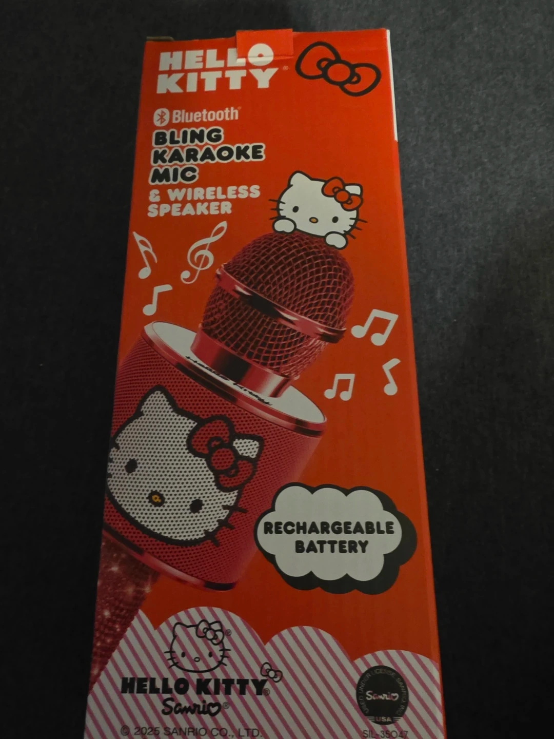 This Hello Kitty karaoke mic and wireless speaker connects via Bluetooth. It features onboard controls and a rechargeable battery. Battery power is 500 mAh with a play time of up to 3 hours. Charge time is 2 hours.