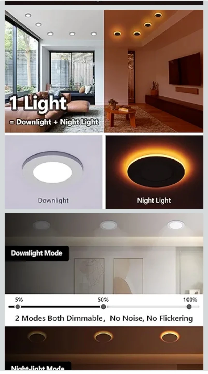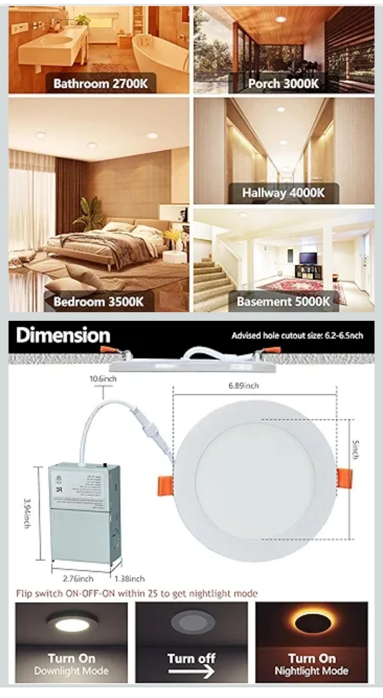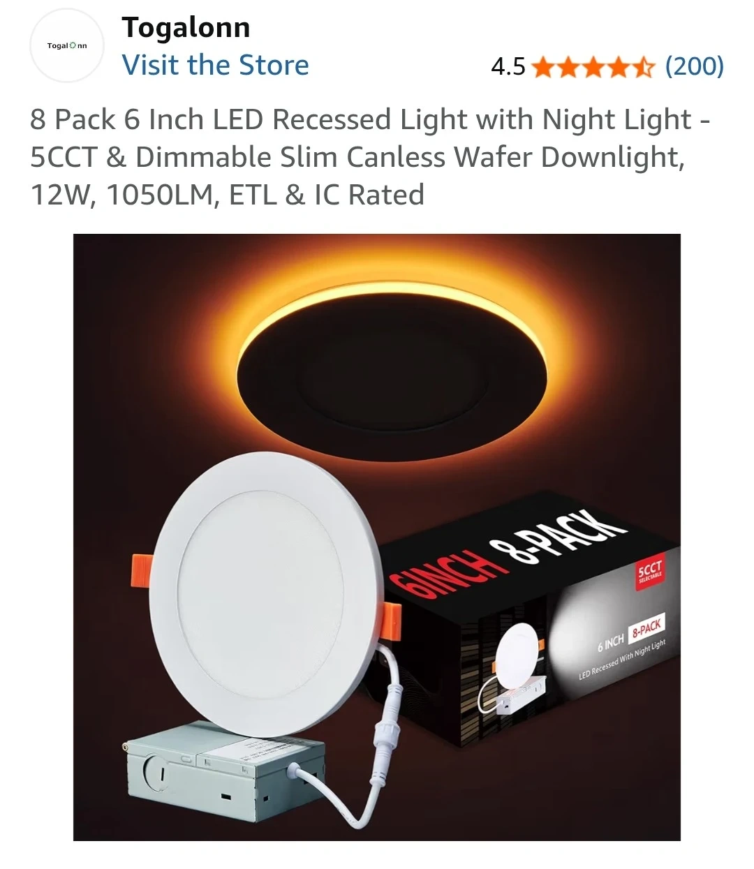 This is an 8-pack of Togalonn 6-inch LED recessed lights. They offer downlight and night light modes, both of which are dimmable. These lights are slim, wafer-style downlights with ETL and IC ratings.