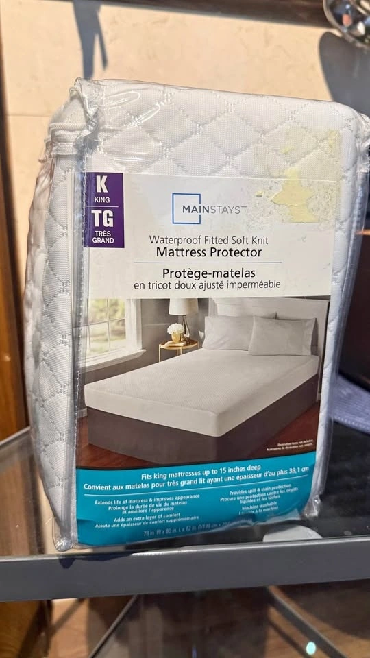 King size waterproof fitted mattress protector — new/unused. The packaging was opened and resealed (see photos), but the protector inside has never been used. Pickup in Stouffville.