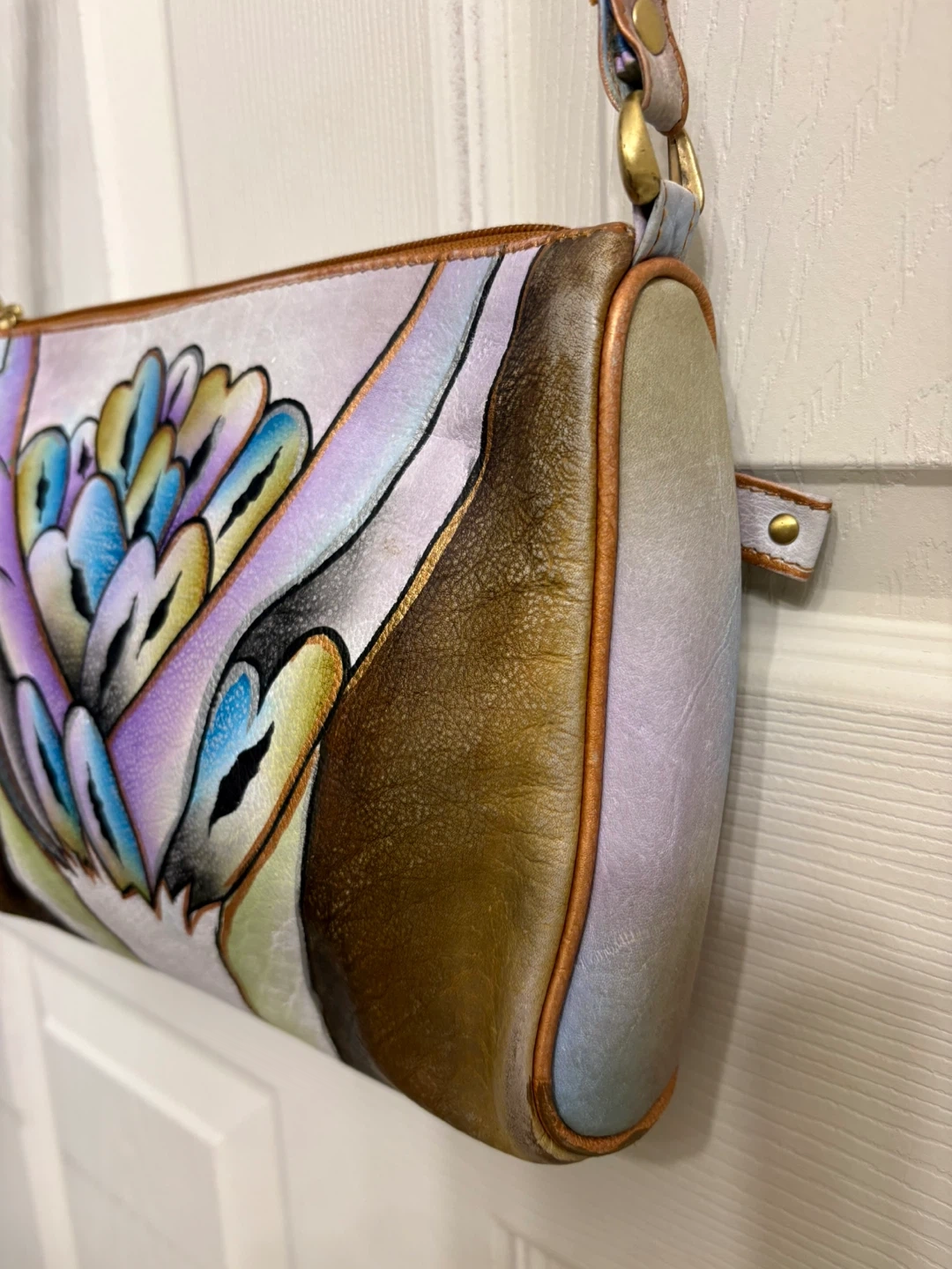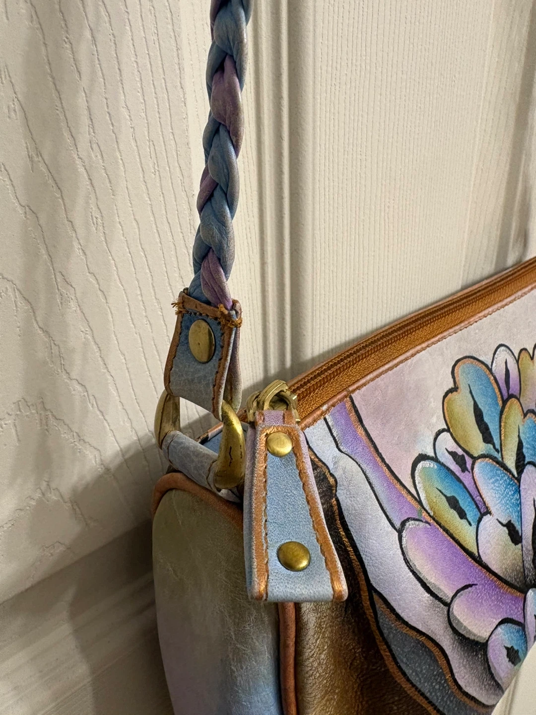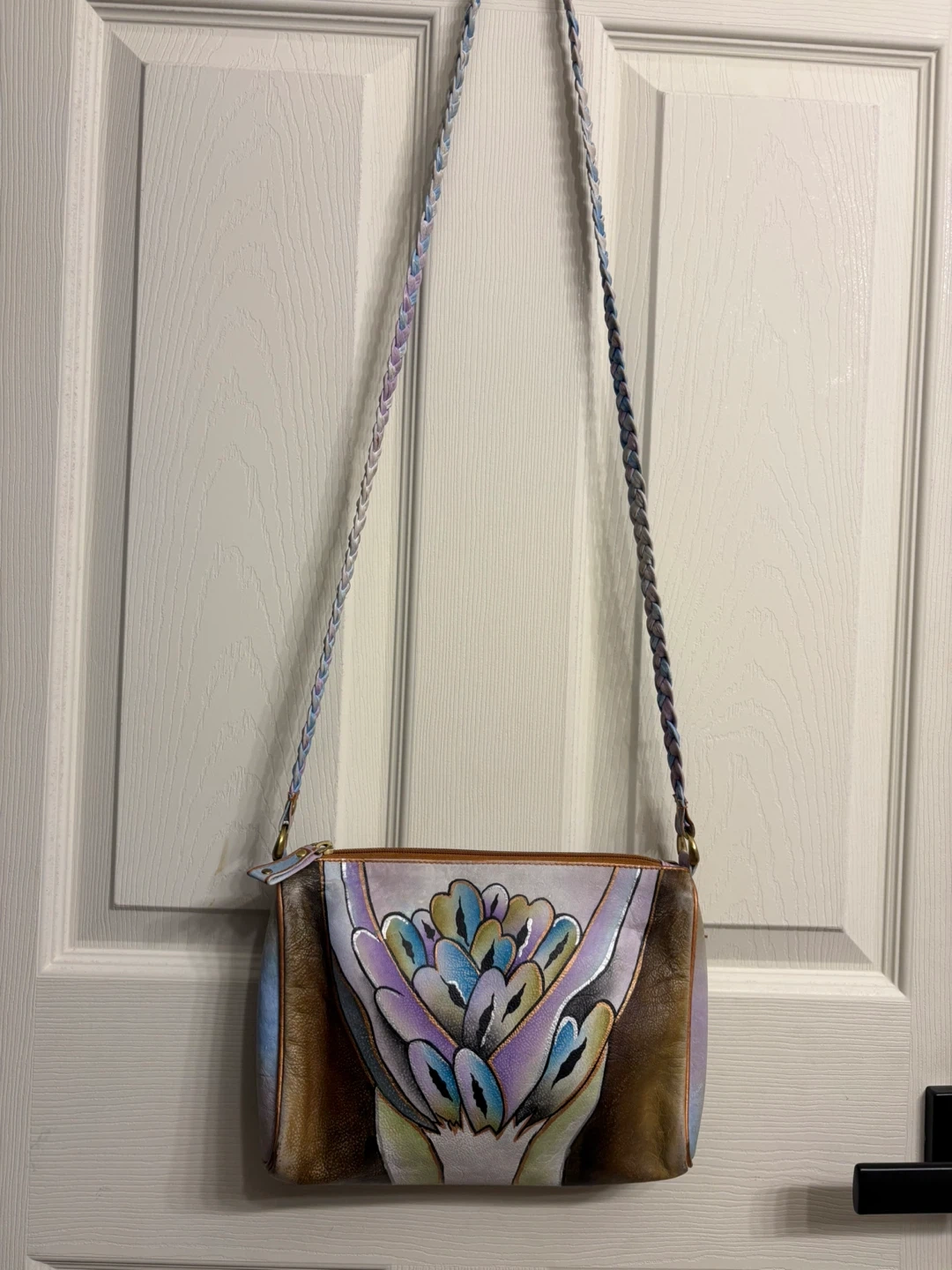 Elevate your style with this artistic hand painted leather shoulder bag, featuring a stunning multicolor design. The strap on this bag is a braid with 3 different colours, unique! Perfect for adding a classy touch to any outfit.