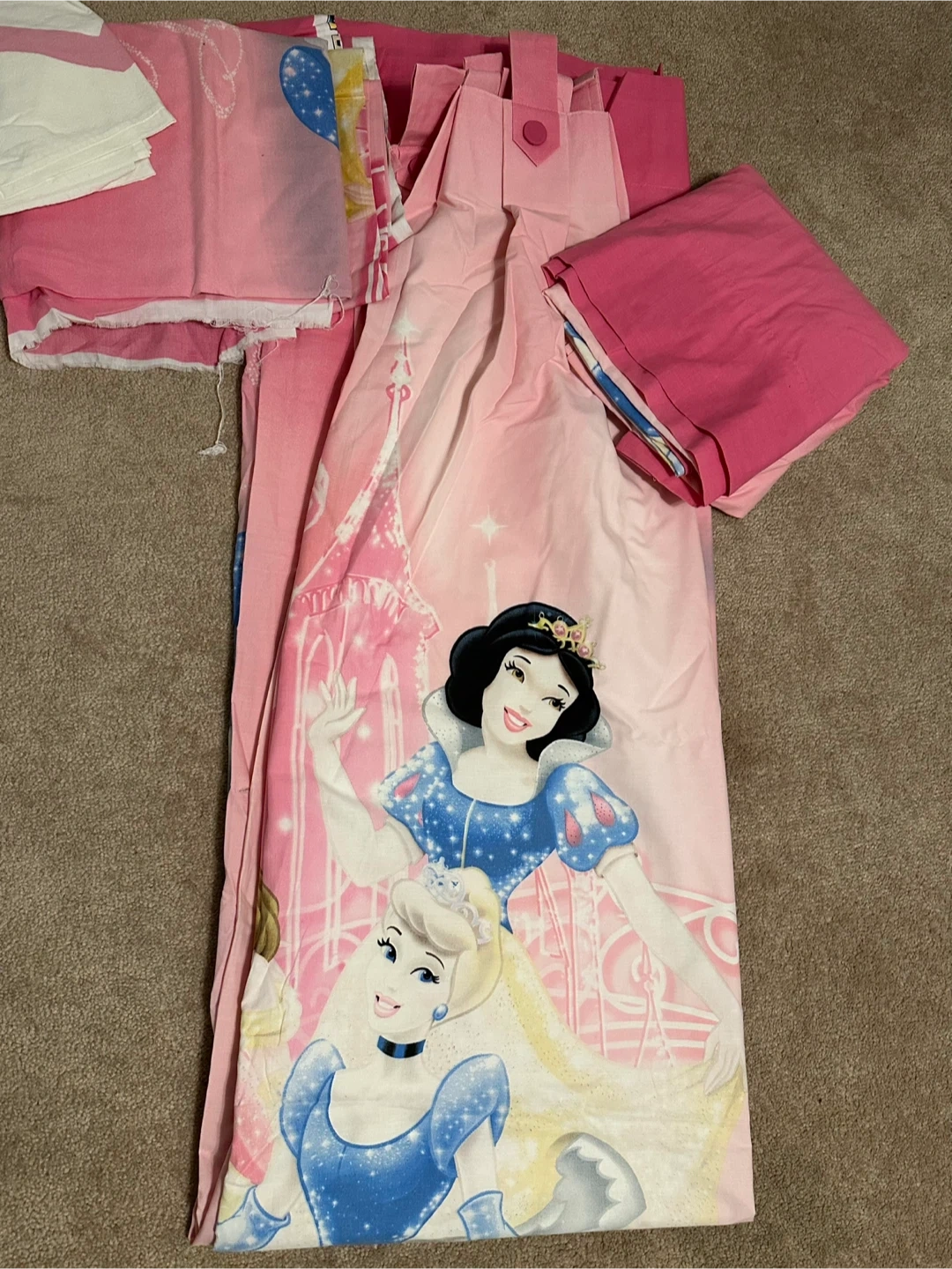 This is a Disney Princesses bedding set featuring Snow White and Cinderella. It includes a comforter and possibly sheets. Perfect for any young fan's room!