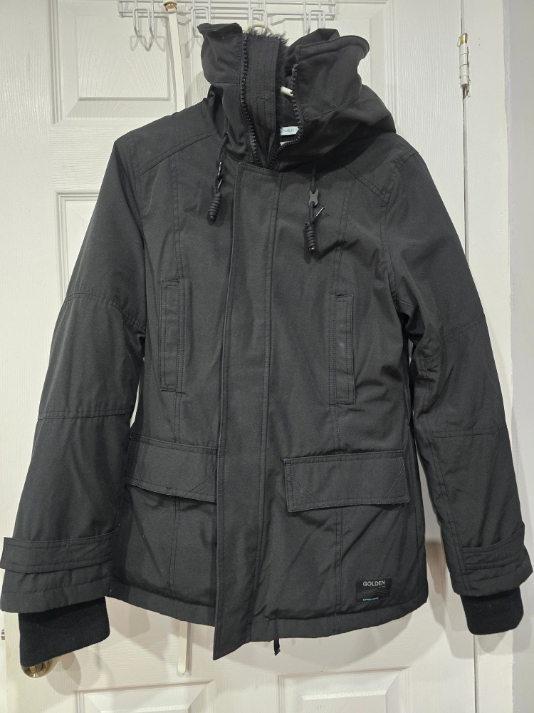 Selling a Golden Larsen Parka in black, women's size large. It's a really warm parka, perfect for the Canadian winter! It features a faux fur trim on the hood and lots of pockets. It comes with detachable fur for hoodie.