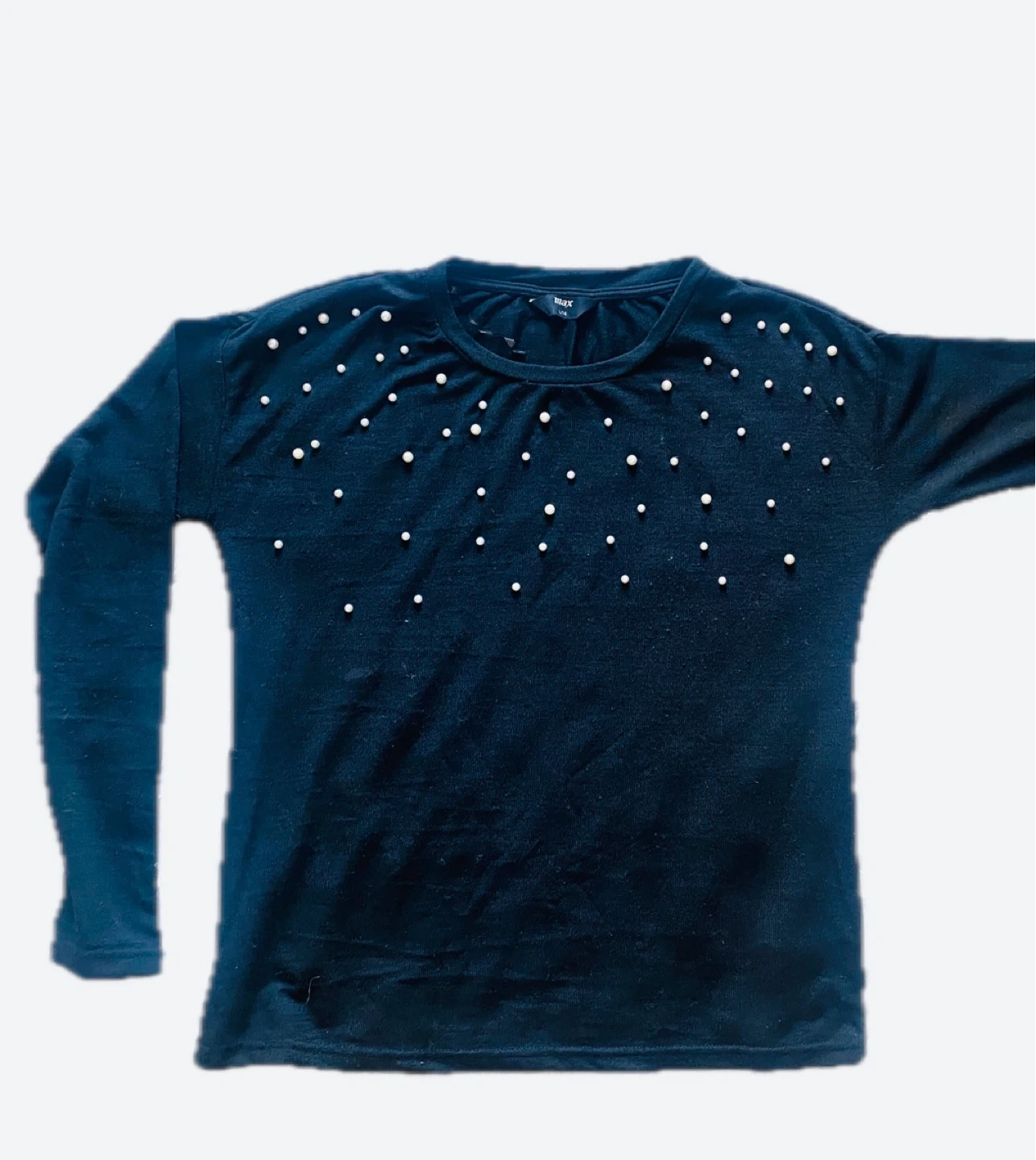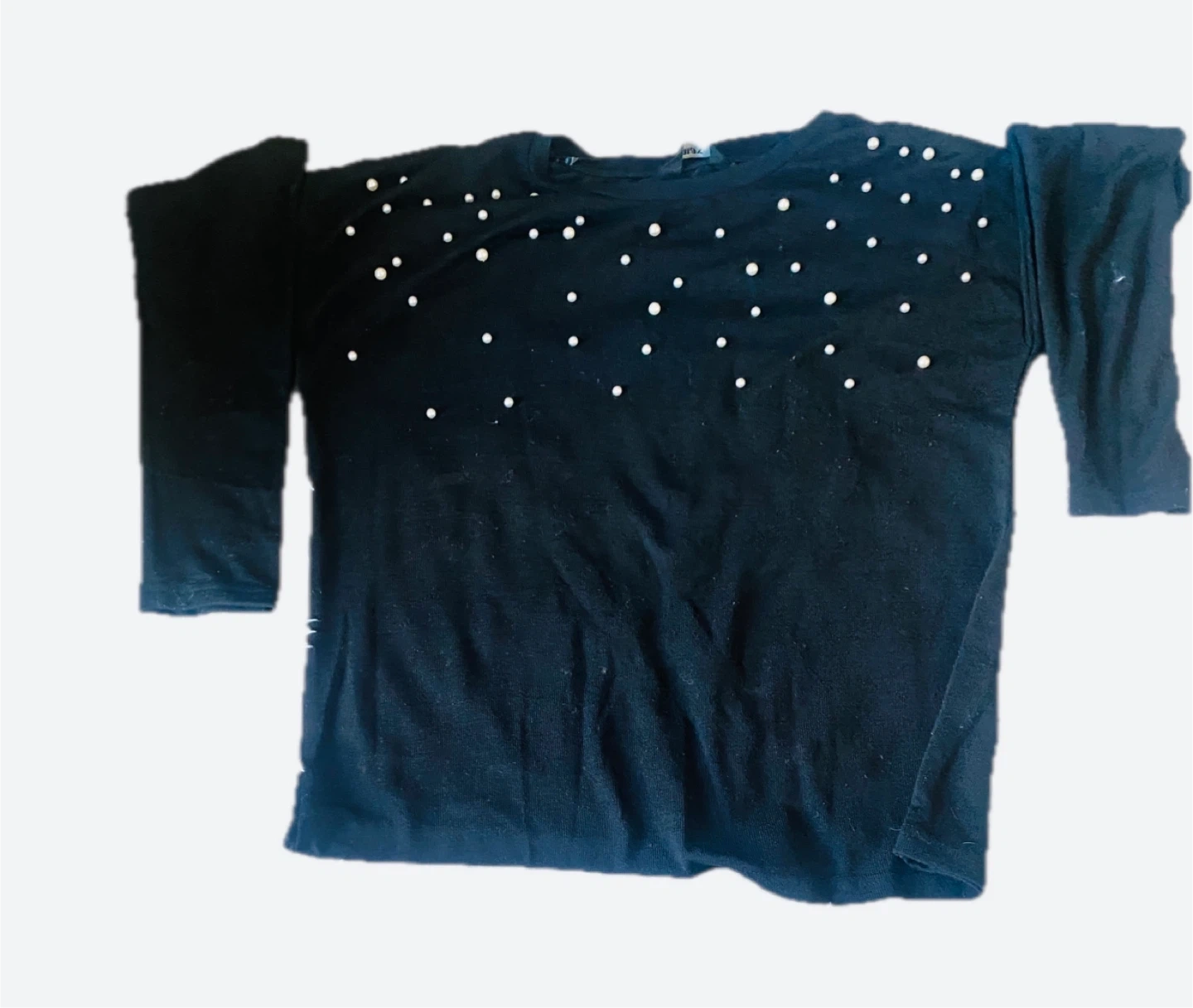 30Selling a cute black long sleeve top! It's a size small and has pearl-like embellishments on the front. Perfect for adding a touch of elegance to any outfit
