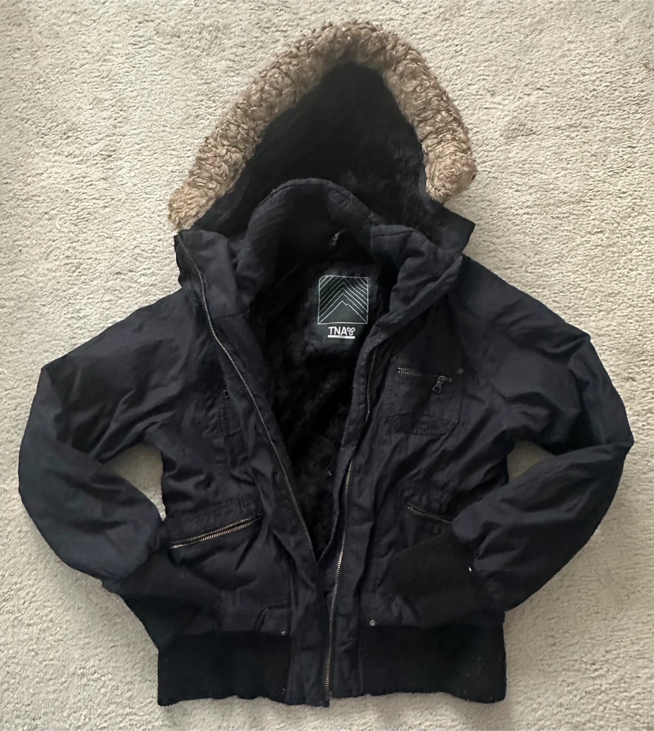 10Selling a TNA winter jacket in black. It has a faux fur lined hood and a warm inner lining, perfect for those cold Canadian winters! It's in great condition and ready for a new home