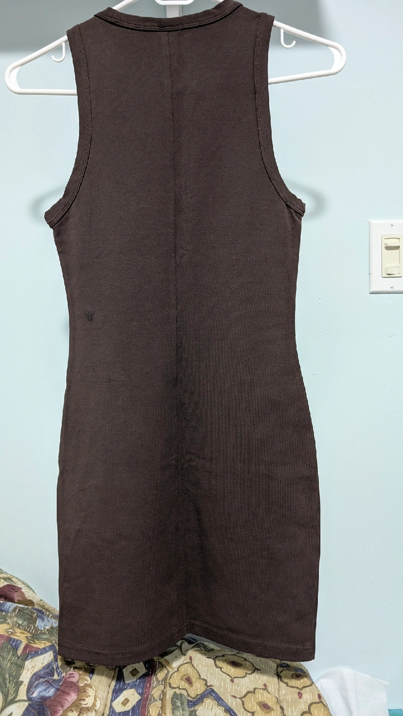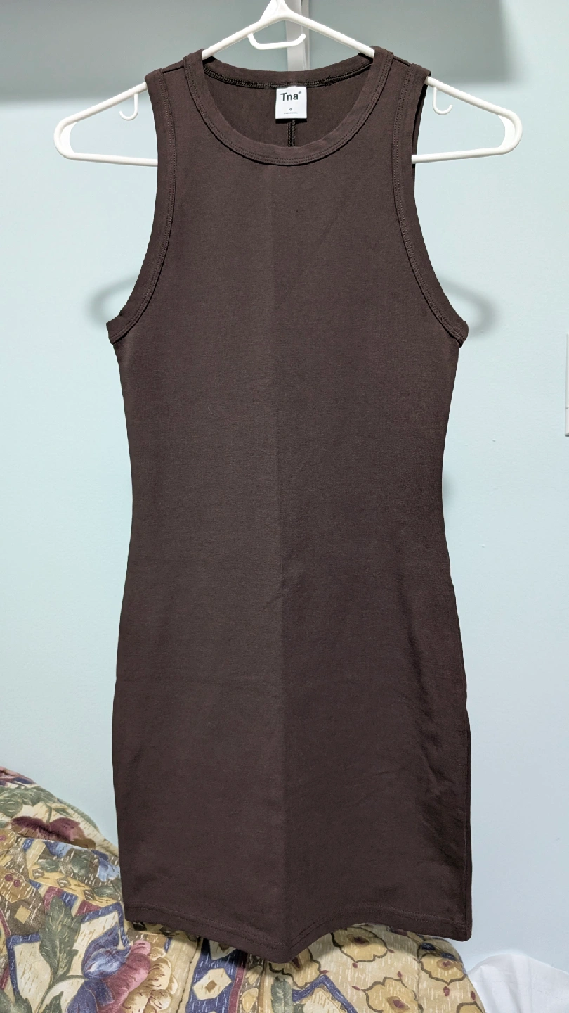 89Selling a cute TNA mini fitted dress in brown, size extra small (XS). Organic Cotton. NEW, never worn! Perfect for casual outings or dressing up for a night out.