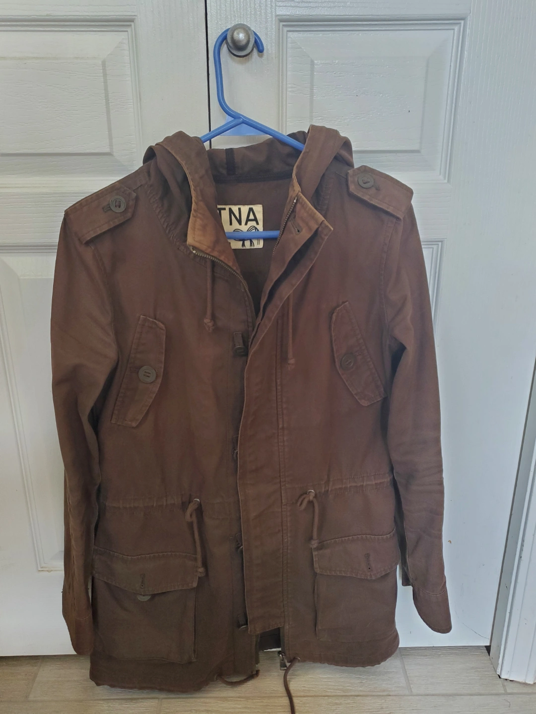 11A brown jacket with a hood. Features buttons and pockets. Great for layering during a chilly evening walk.