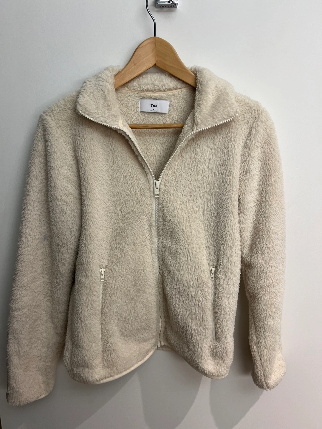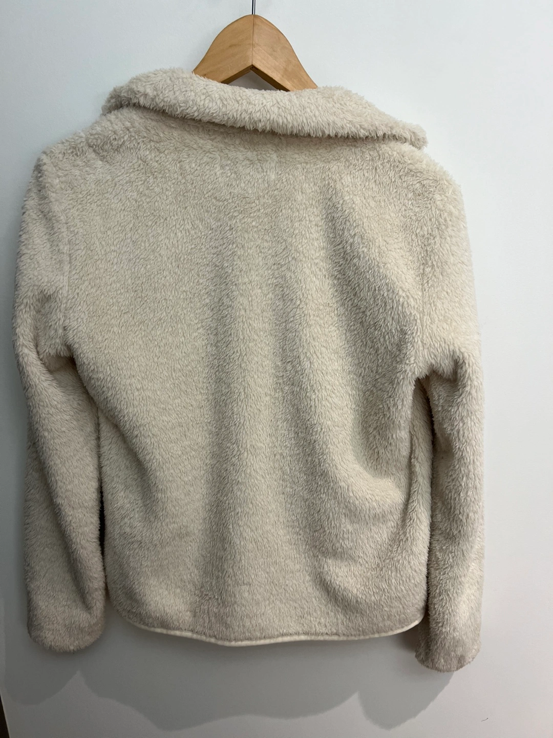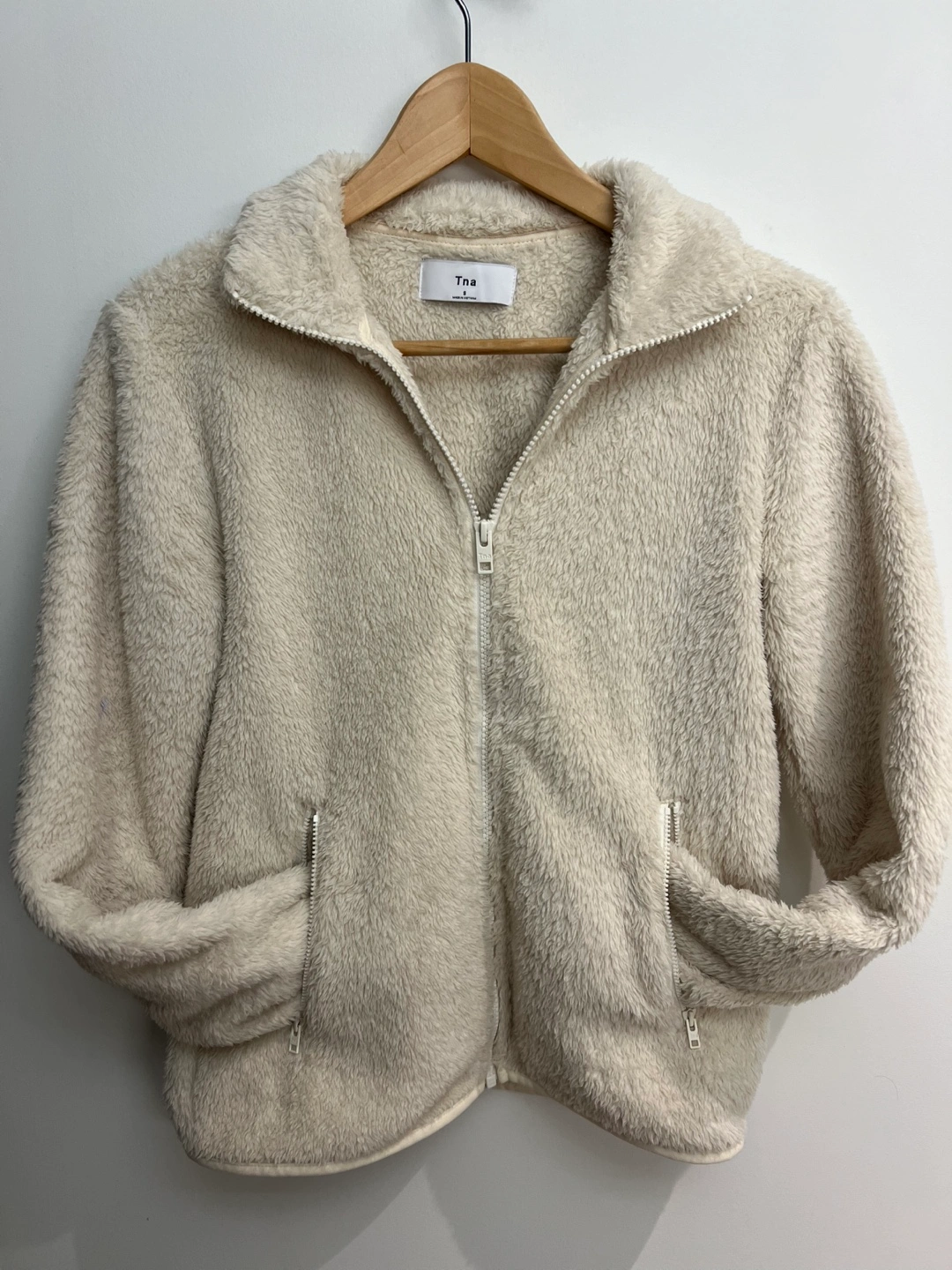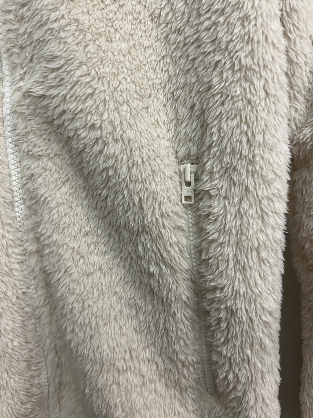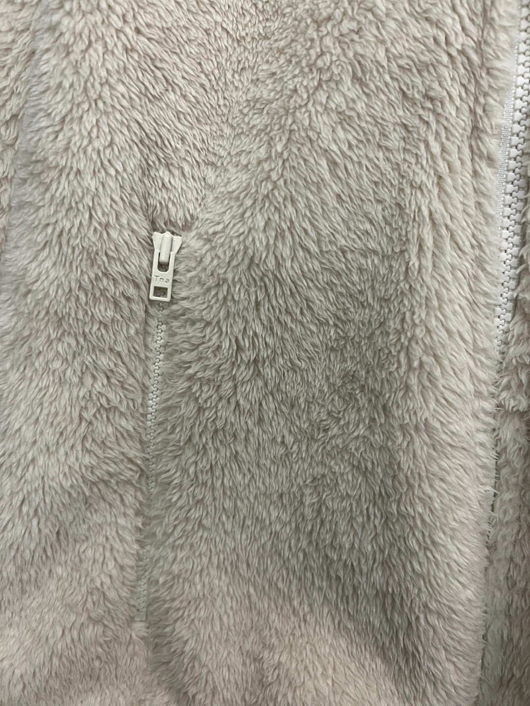 52Cream coloured fuzzy zip-up jacket. Long sleeves. Two front pockets. Pick up near Metrotown